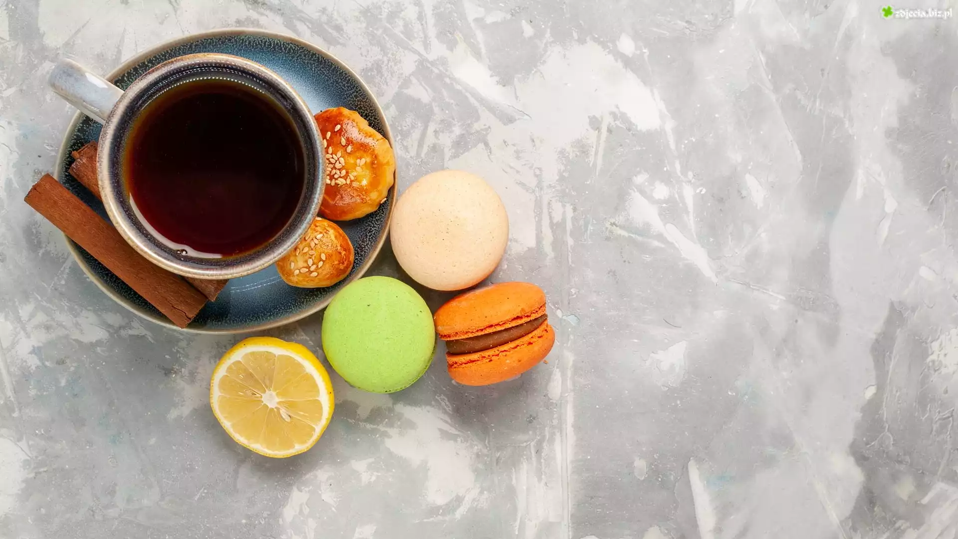 Zdjęcie, Kawa, Filiżanka, Cynamon, Makaroniki, Ciasteczka