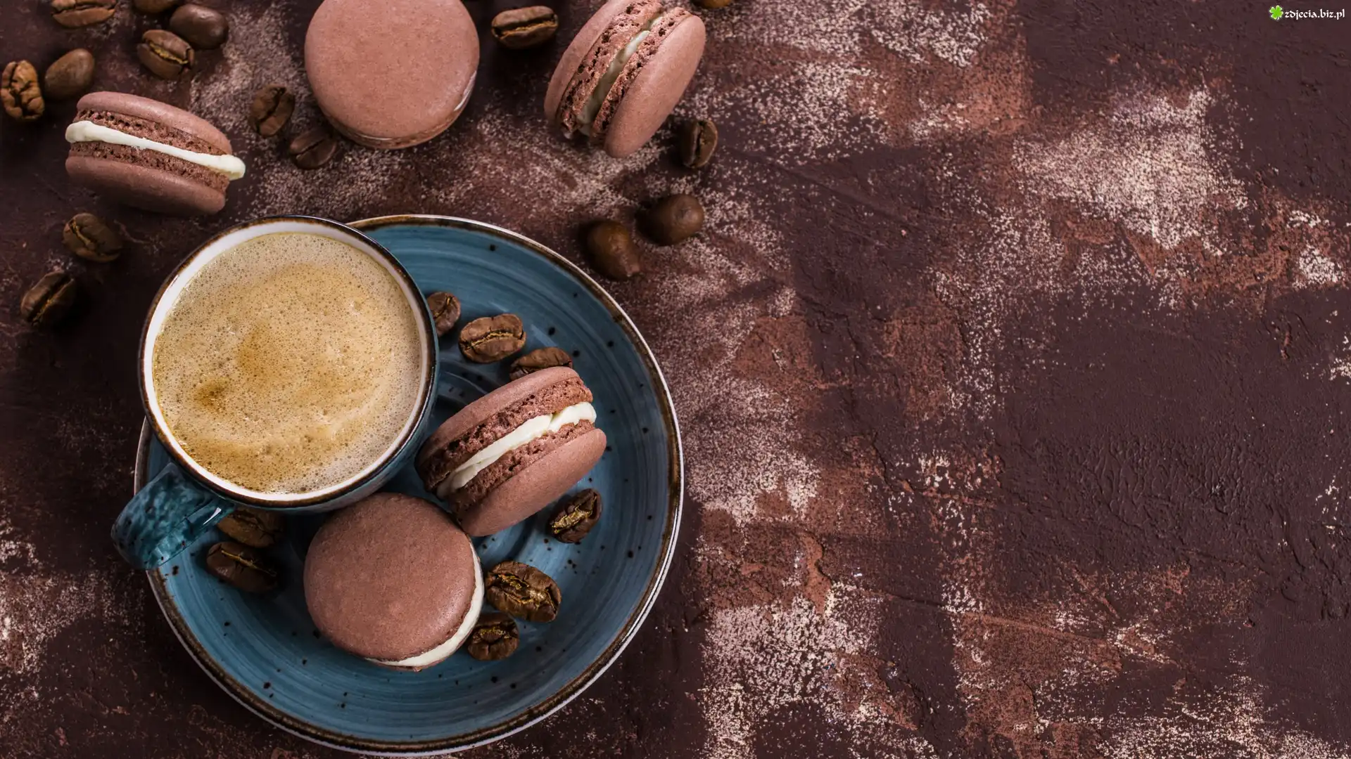 Zdjęcie Kawa, Filiżanka, Talerzyk, Ciastka, Makaroniki, Ziarna