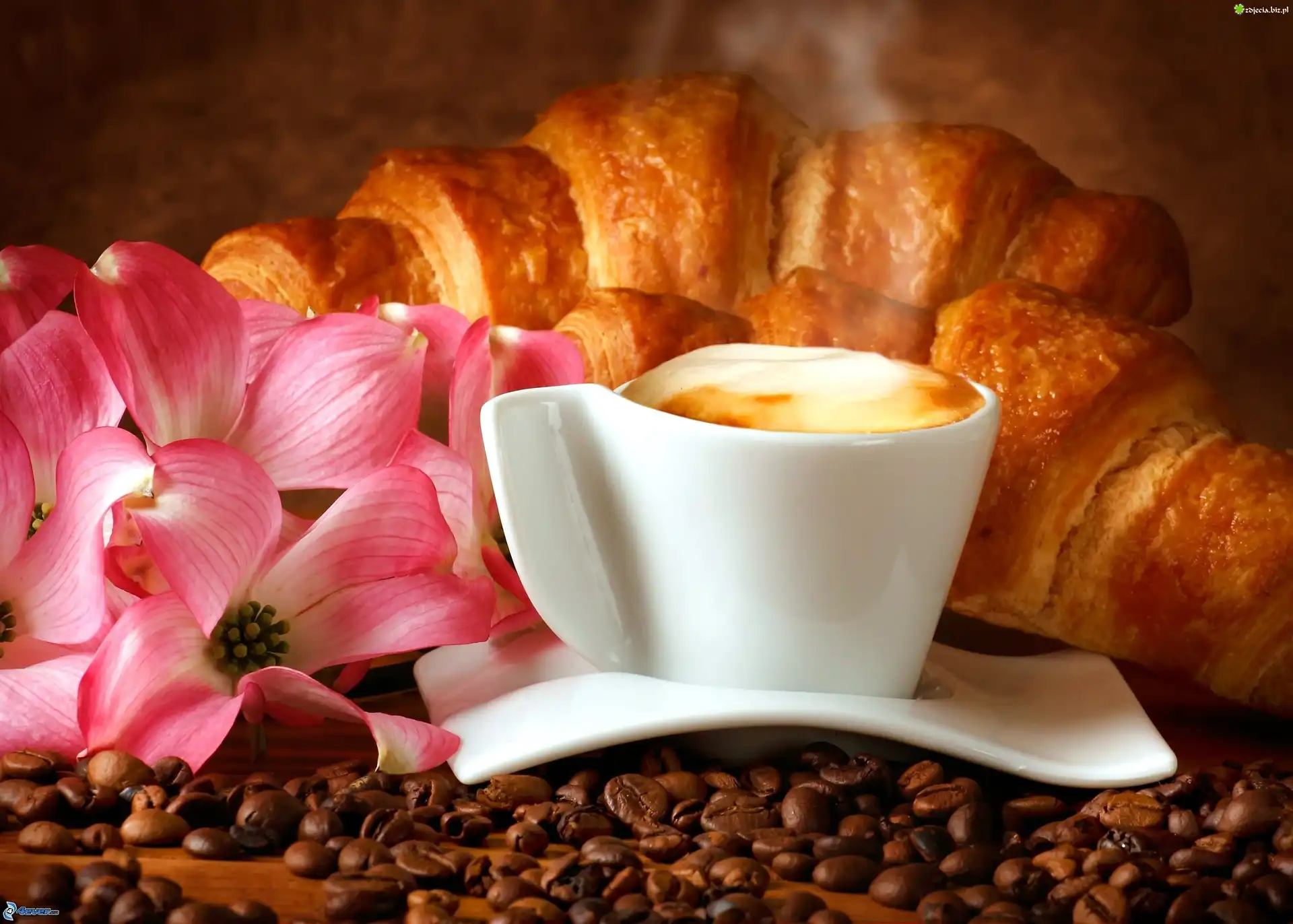 Zdjęcie, Rogale, Kawa, Kwiatki