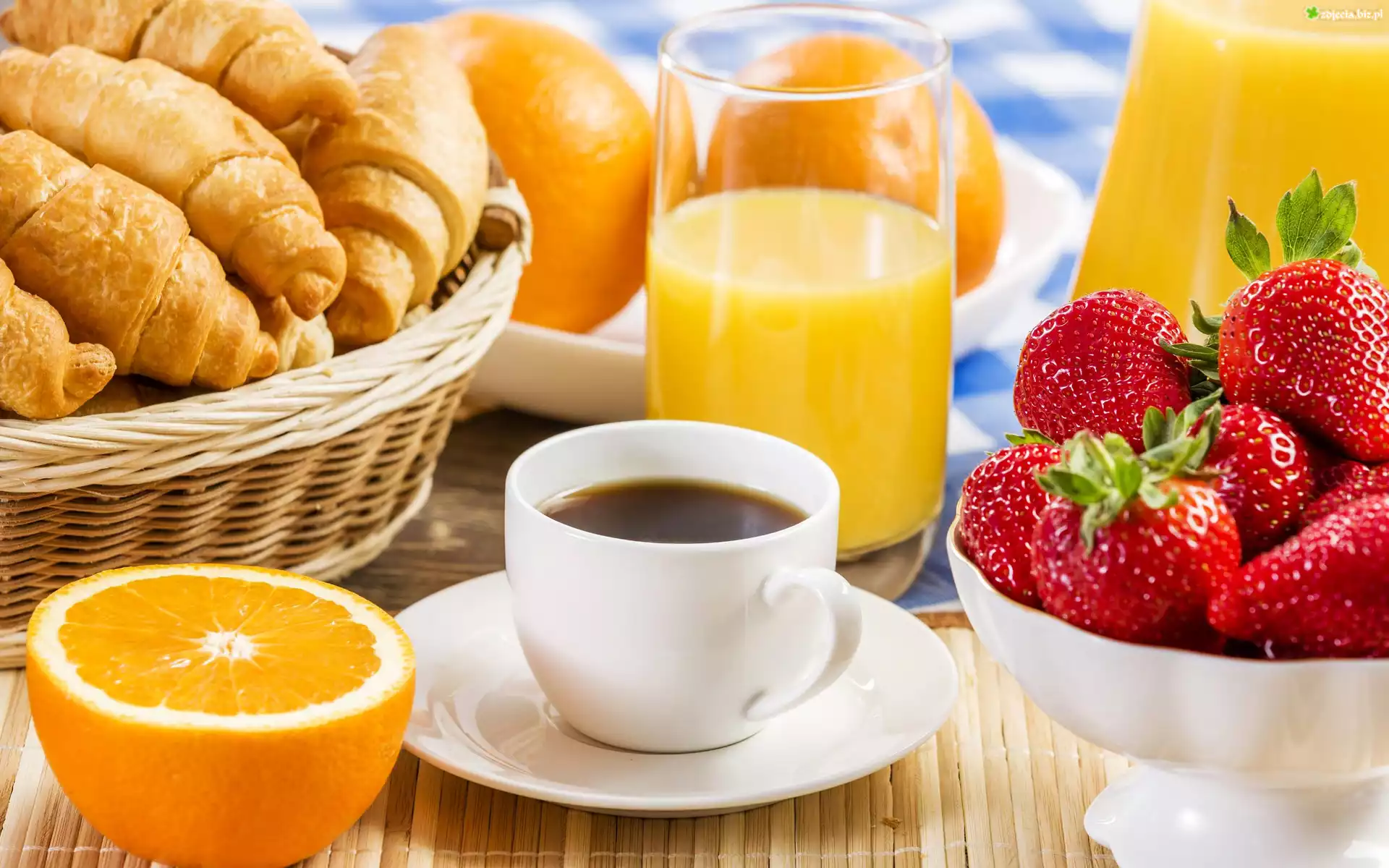 Zdjęcie, Kawa, Filiżanka, Pomarańcze, Truskawki, Rogaliki, Sok