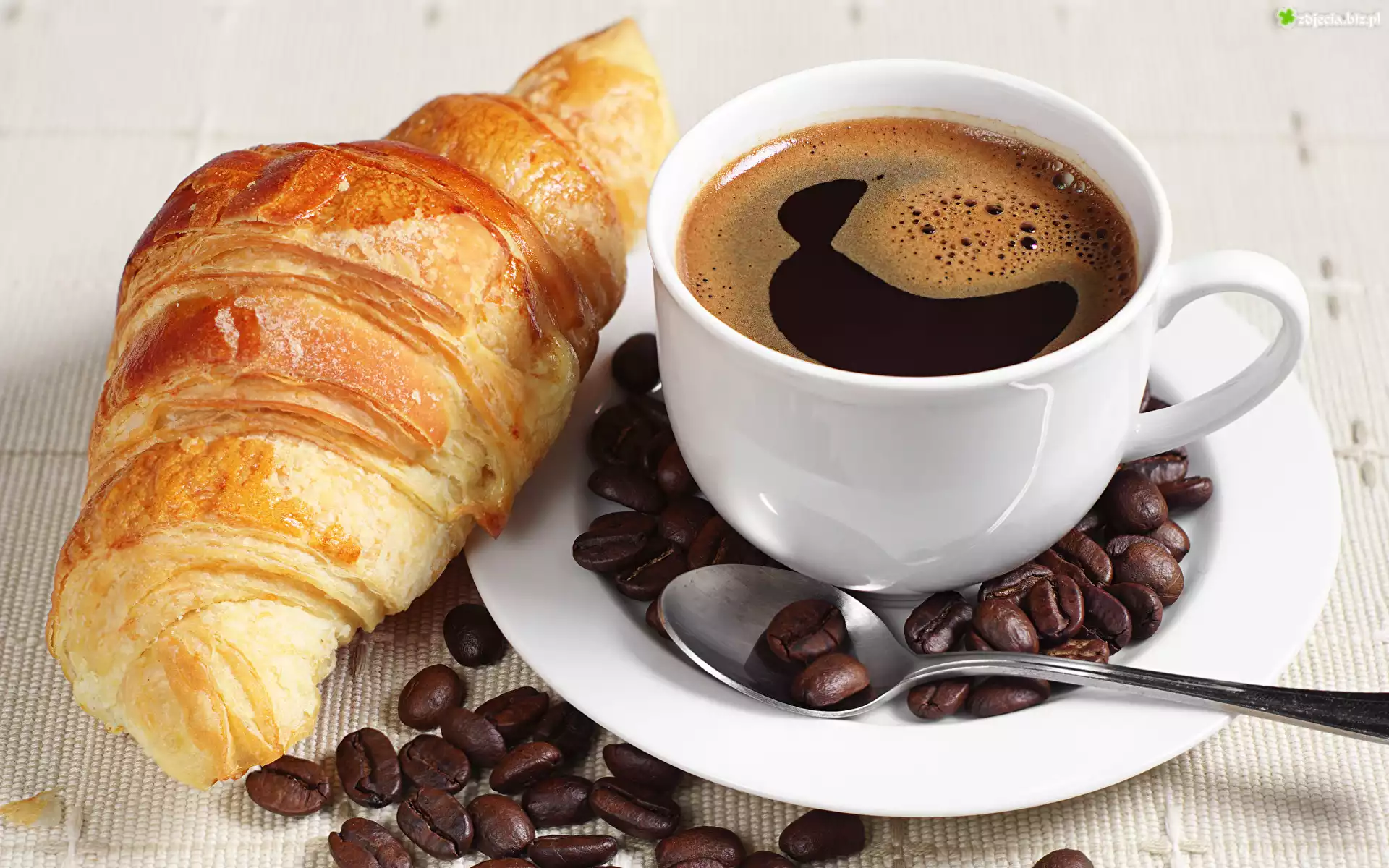 Zdjęcie Kawa, Ziarna, Biała, Filiżanka, Talerzyk, Rogal