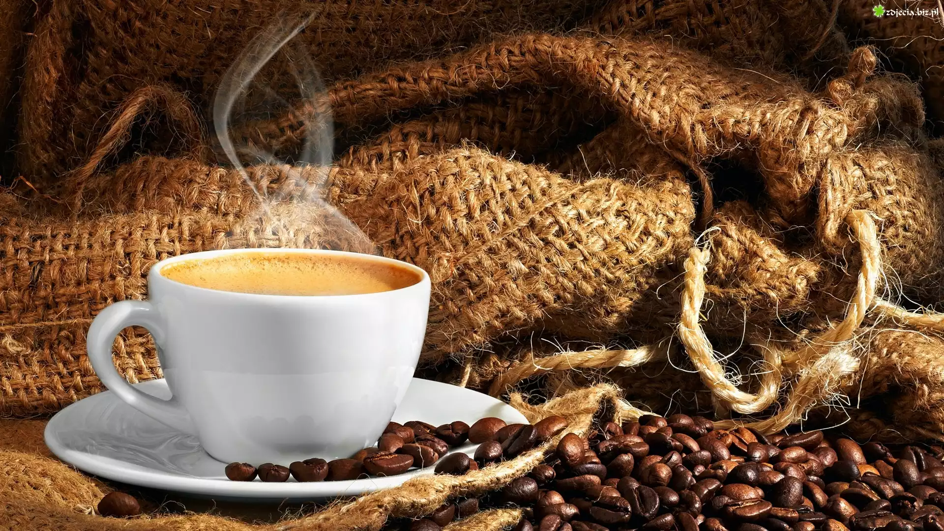 Zdjęcie Kawa, Ziarna, Biała, Filiżanka, Talerzyk, Worek