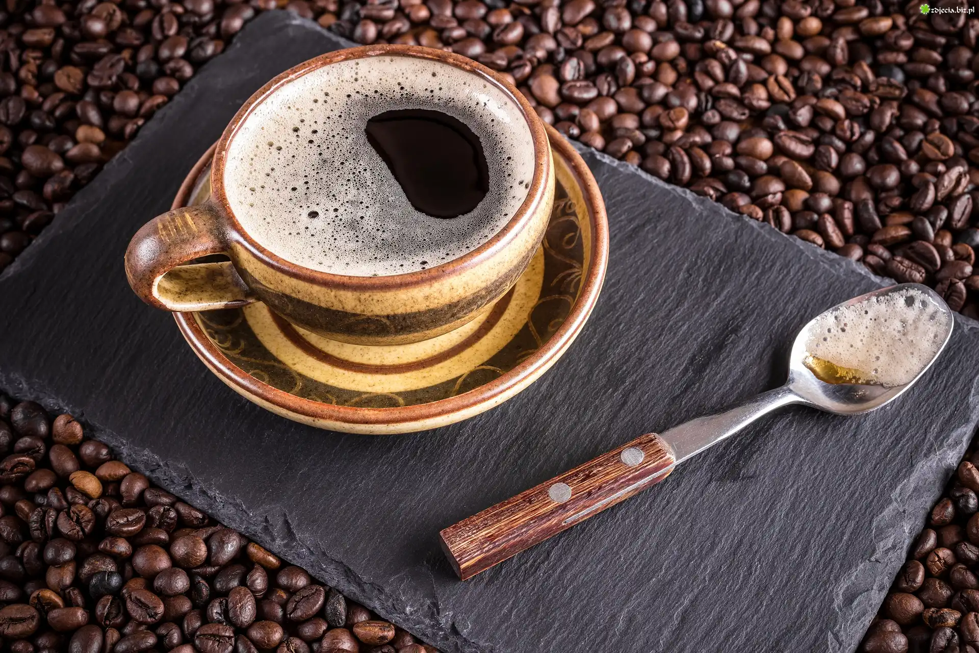 Zdjęcie, Kawa, Filiżanka, Łyżeczka, Ziarna
