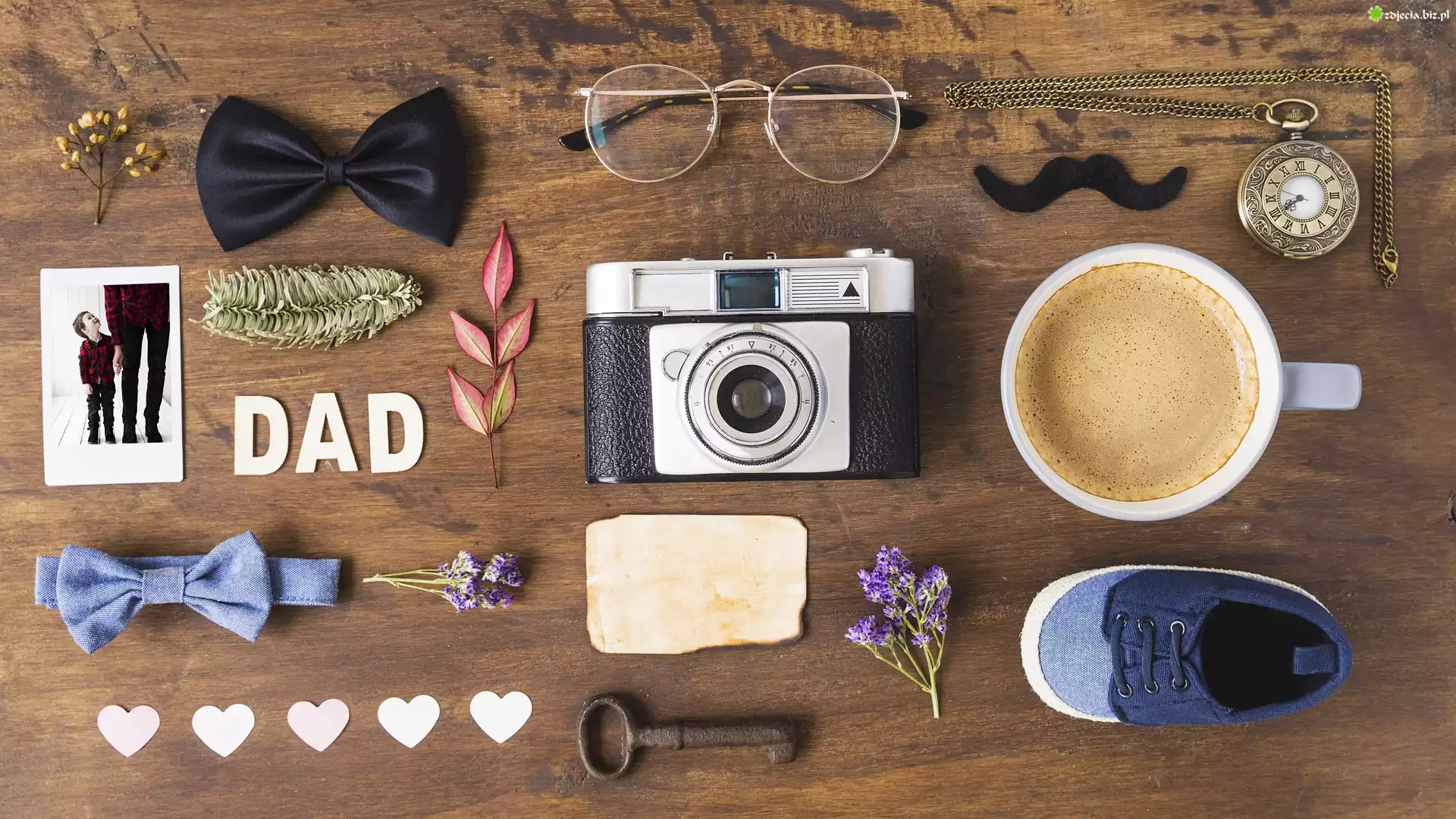 Zdjęcie Dzień Ojca, Kawa, Muszka, Zdjęcie, Aparat, Klucz, Kwiaty, Zegarek, Okulary, Bucik