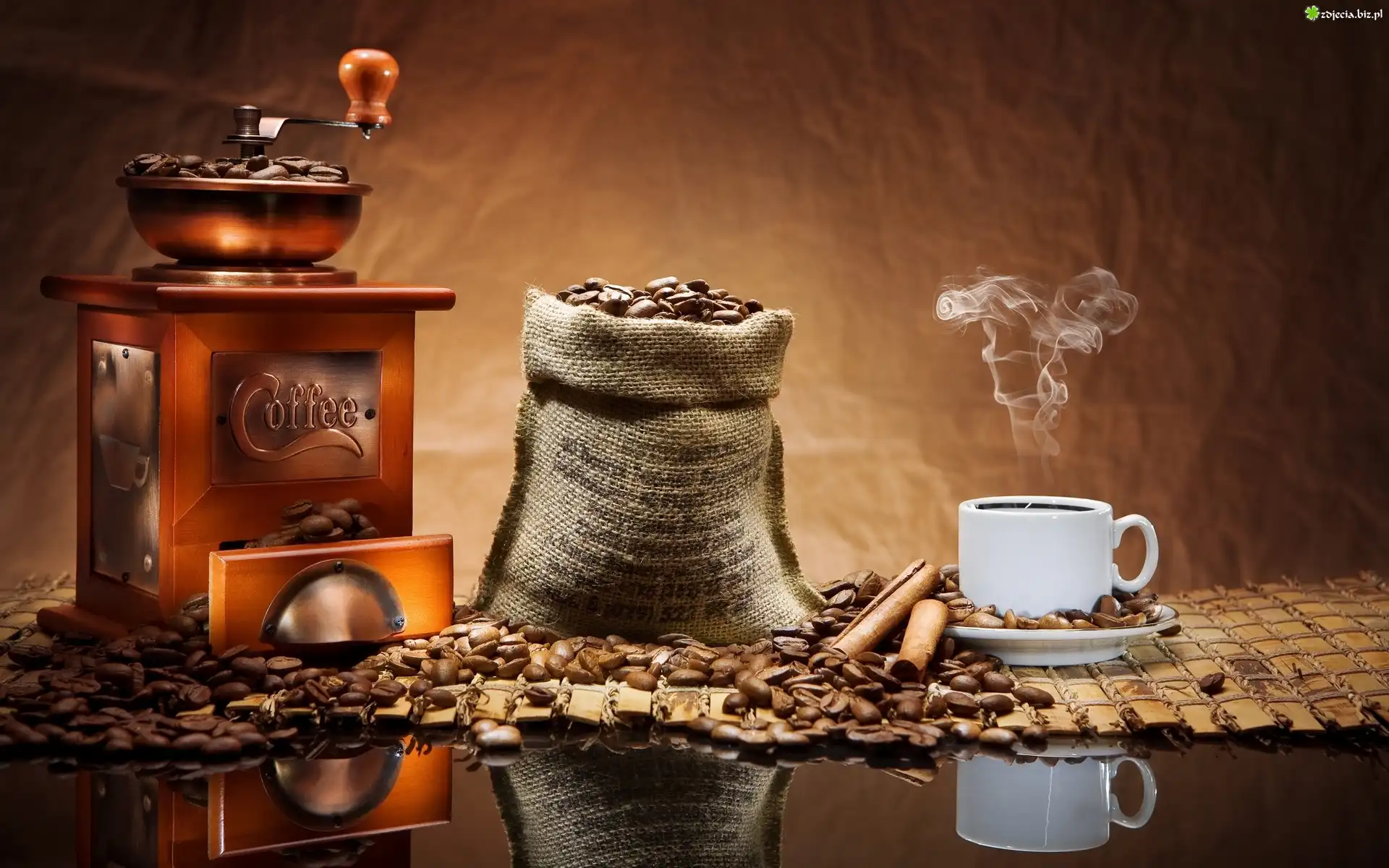Zdjęcie Kawa, W, Filiżance, Ziarna, Młynek