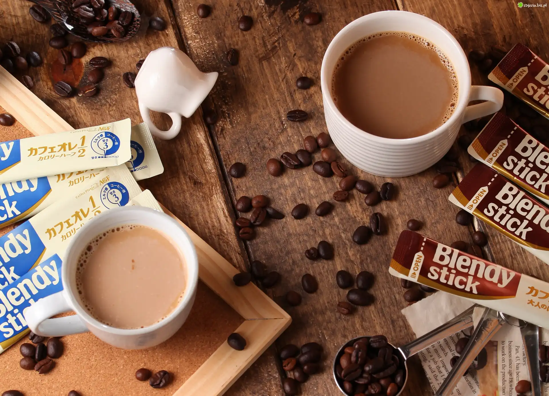 Zdjęcie Kawa, Filiżanki, Ziarna, Deski
