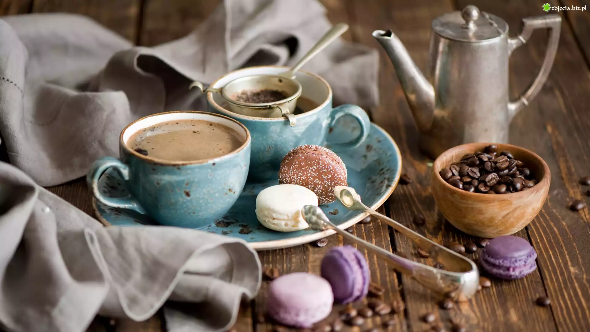 Zdjęcie Kompozycja, Kawa, Filiżanki, Dzbanek, Ciasteczka, Makaroniki, Miseczka, Ziarna