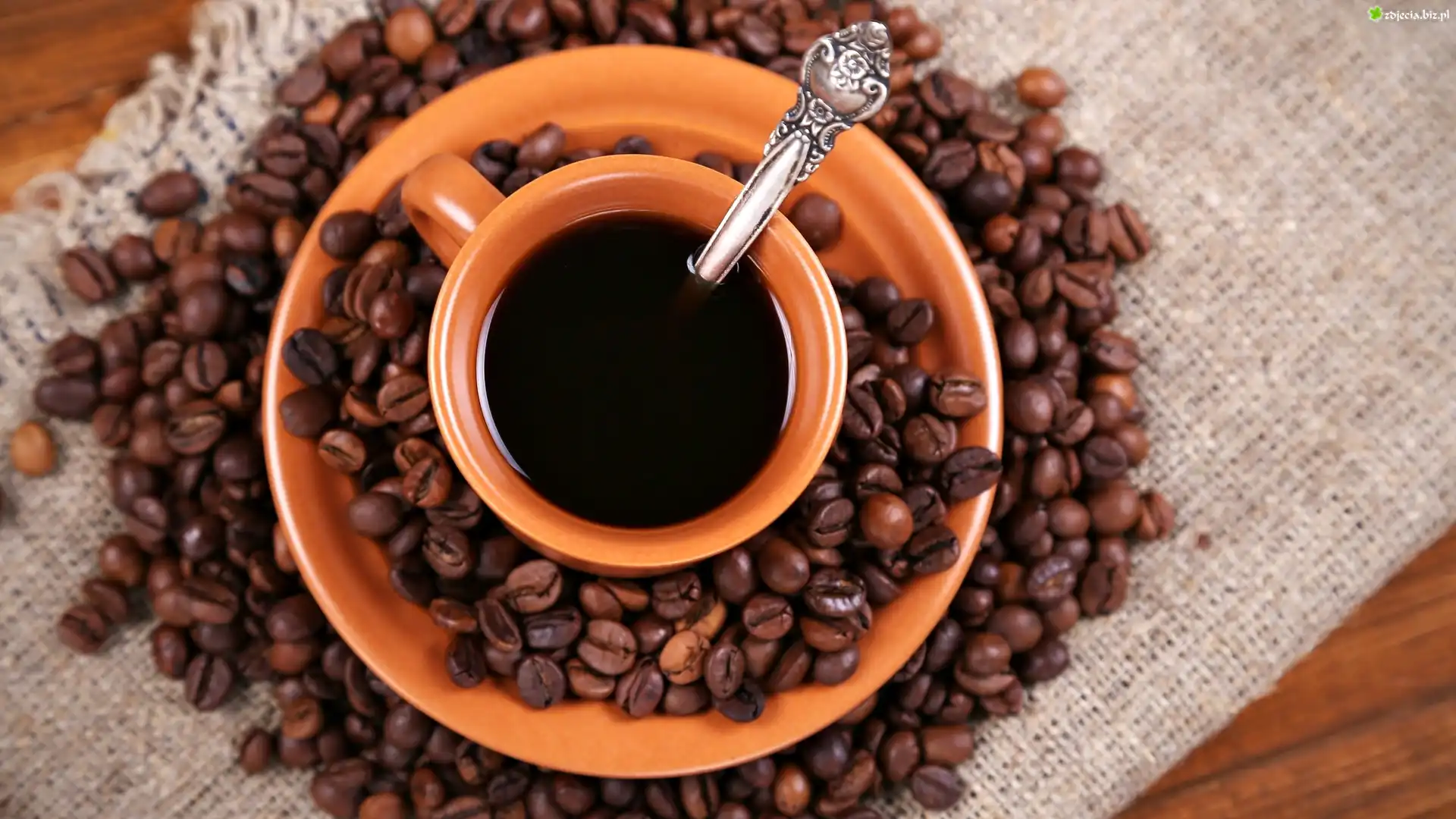 Zdjęcie Ziarna, Kawa, Brązowa, Filiżanka, Talerzyk, Łyżeczka, Serwetka