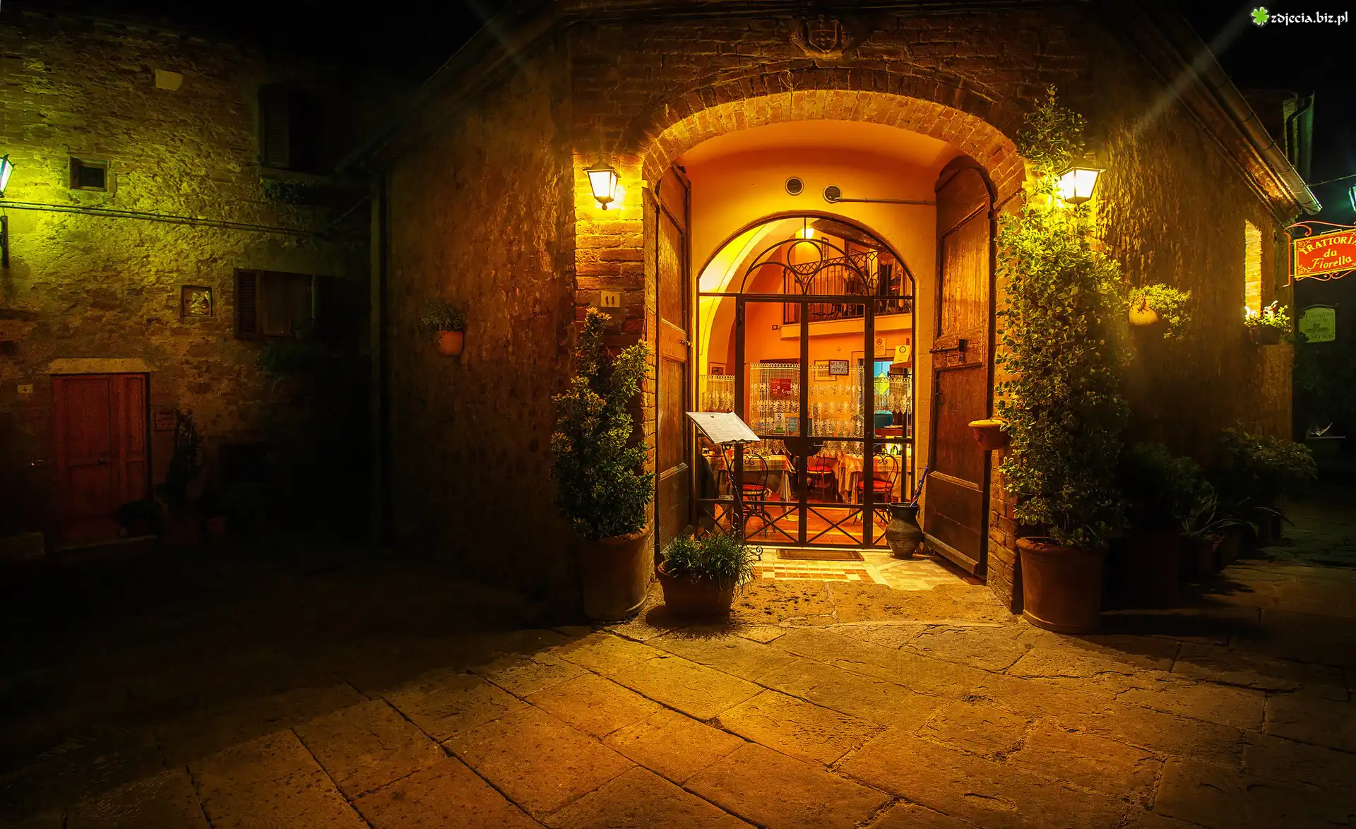 Zdjęcie, Kawiarnia, Wejście, Ulica, Kwiaty, Oświetlenie