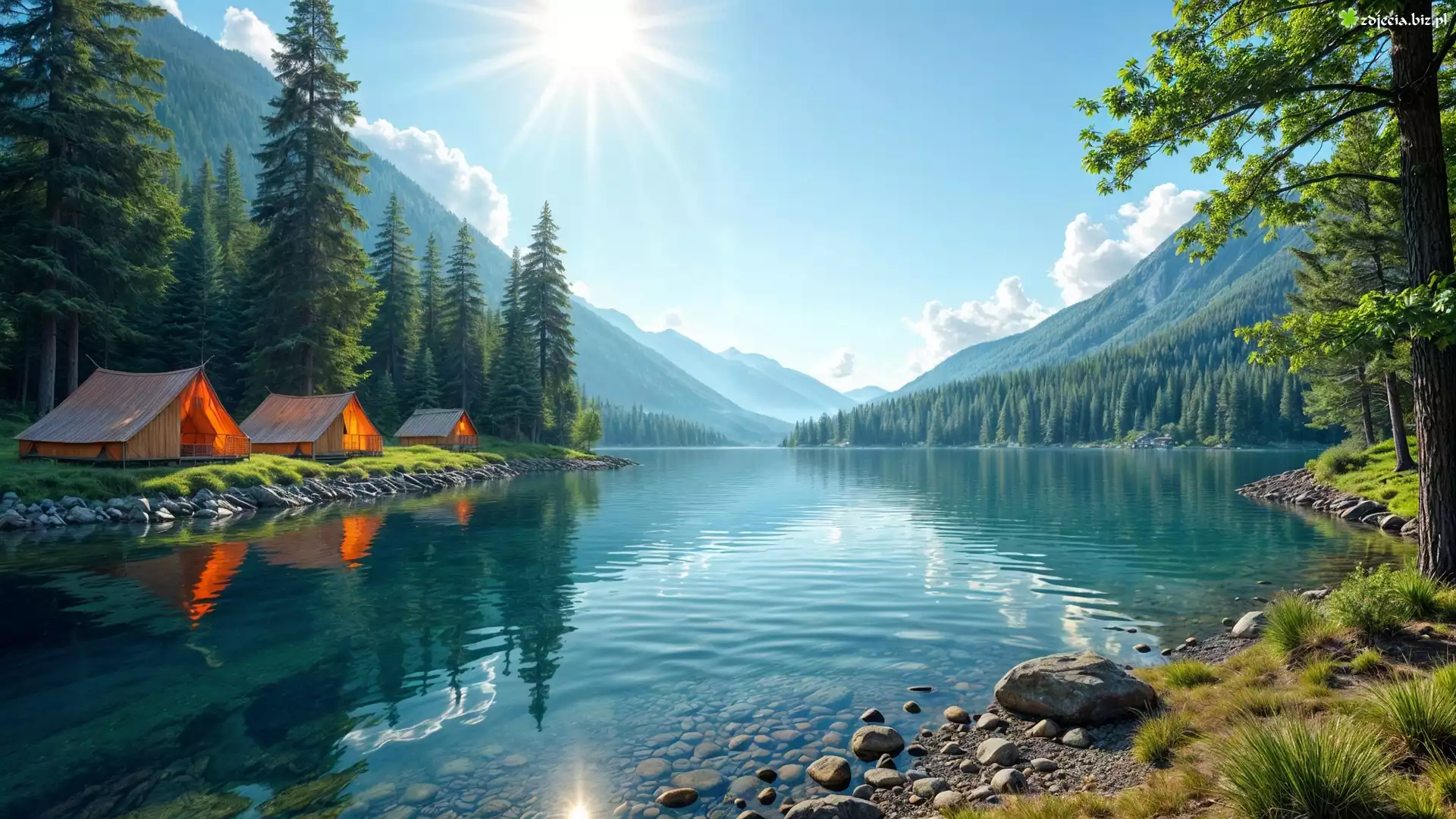Zdjęcie Jezioro, Kemping, Namioty, Góry, Drzewa