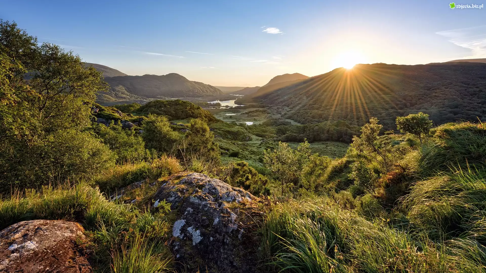 Zdjęcie Irlandia, Park Narodowy Killarney, Hrabstwo Kerry, Promienie słońca, Góry, Drzewo, Trawa, Skały |