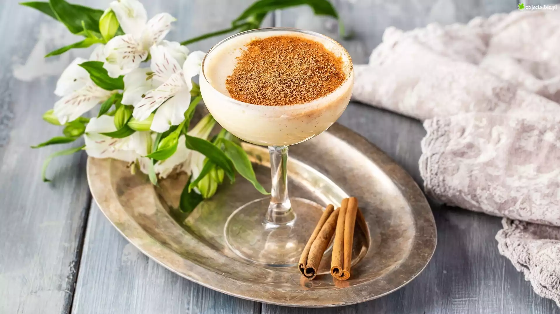 Zdjęcie Ajerkoniak, Kieliszek, Czekolada, Cynamon, Kwiaty, Alstremeria, Taca, Deski