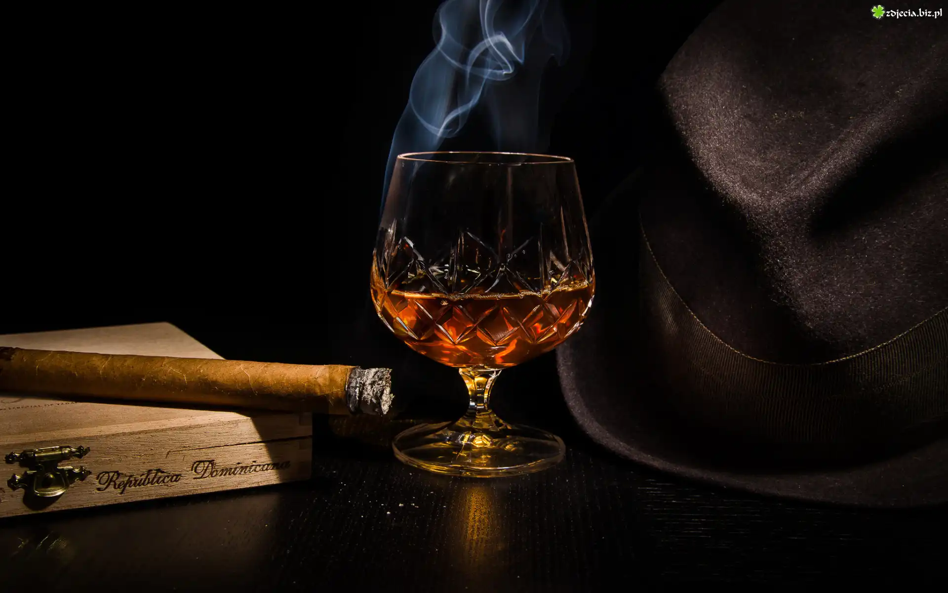 Zdjęcie Kapelusz, Kieliszek, Koniak, Cygaro, Dym, Pudełko, Kompozycja