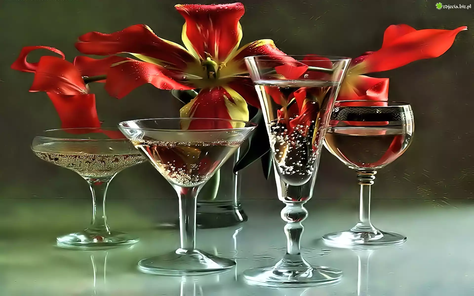 Zdjęcie Kieliszki, Szampan, Czerwony, Kwiat