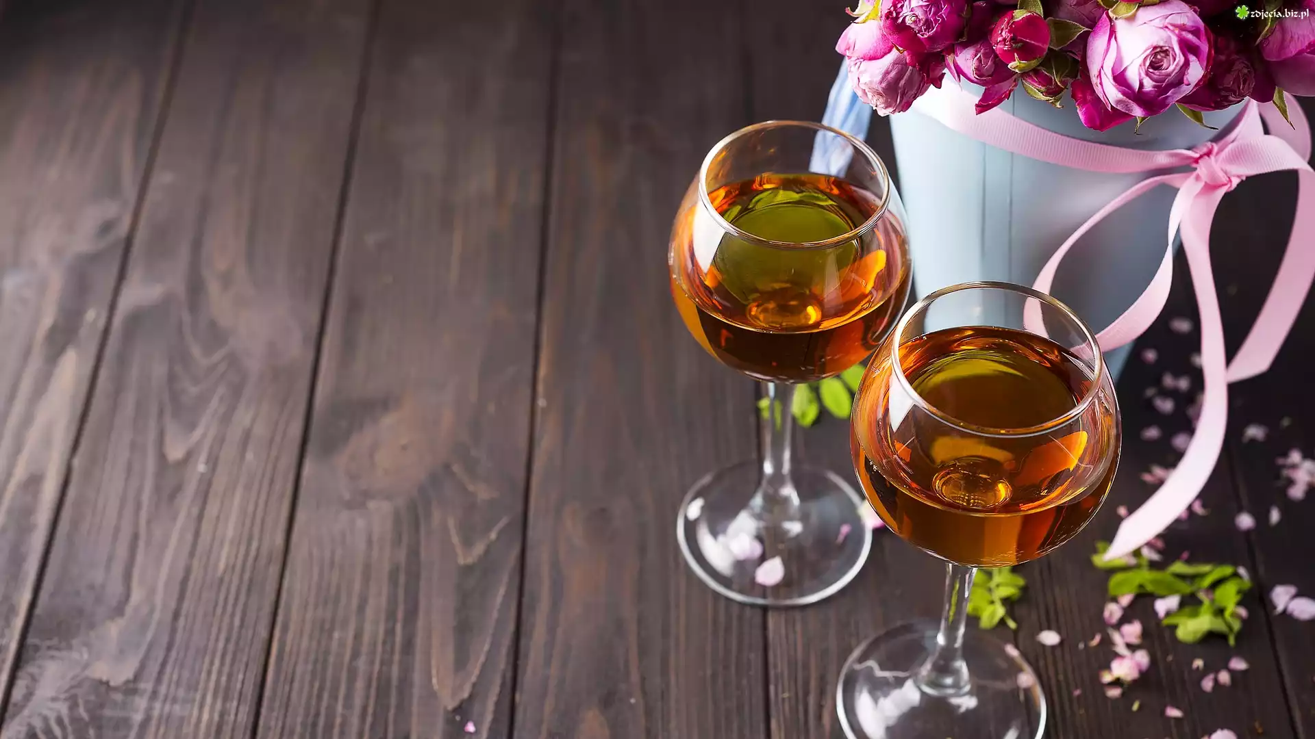 Zdjęcie Dwa, Kieliszki, Wino, Róże, Bukiet, Wstążka, Deski