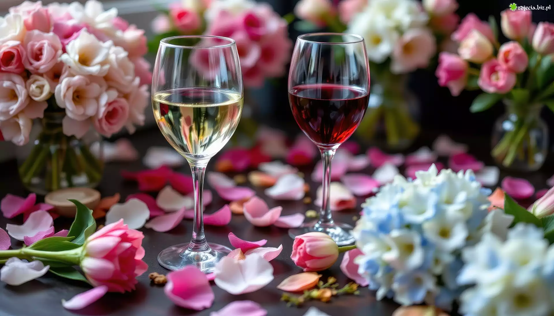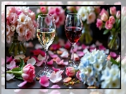 Zdjęcie Dwa, Kieliszki, Wino, Kwiaty, Płatki