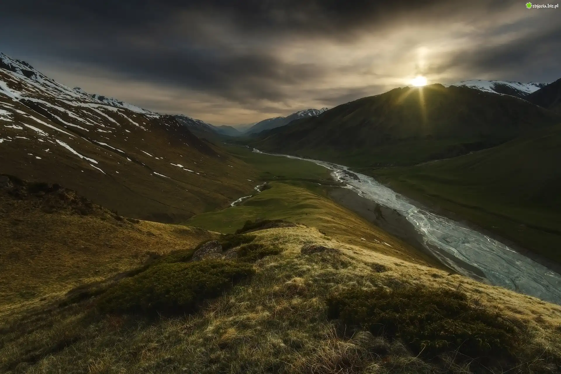 Zdjęcie Góry Tienszan, Chmury, Promienie słońca, Rzeka Chon-Kemin, Kirgistan