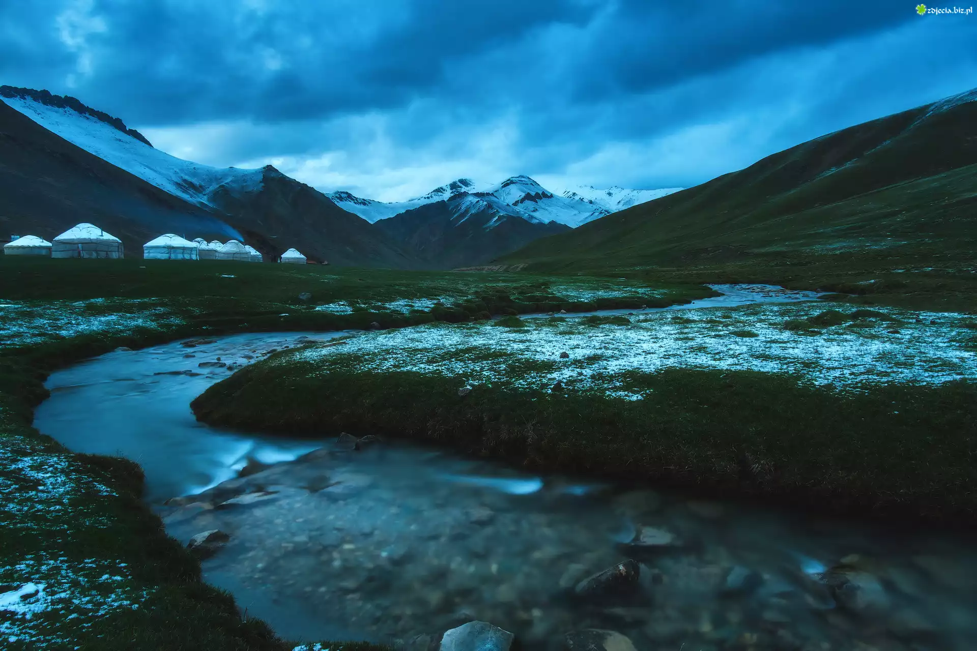 Zdjęcie Góry, Rzeka, Śnieg, Trawa, Tash Rabat, Obwód naryński, Kirgistan