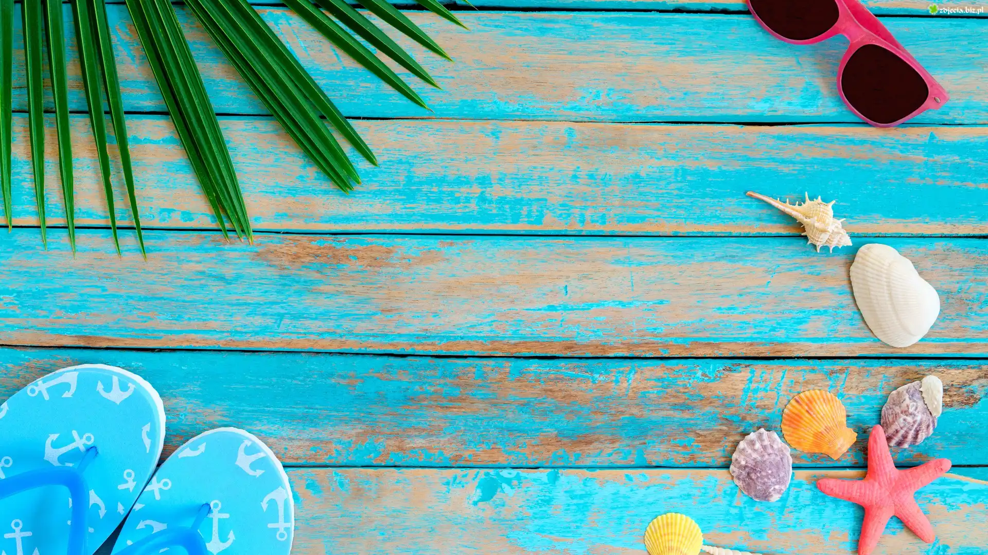 Zdjęcie Klapki, Muszelki, Rozgwiazda, Okulary, Deski, Wakacje
