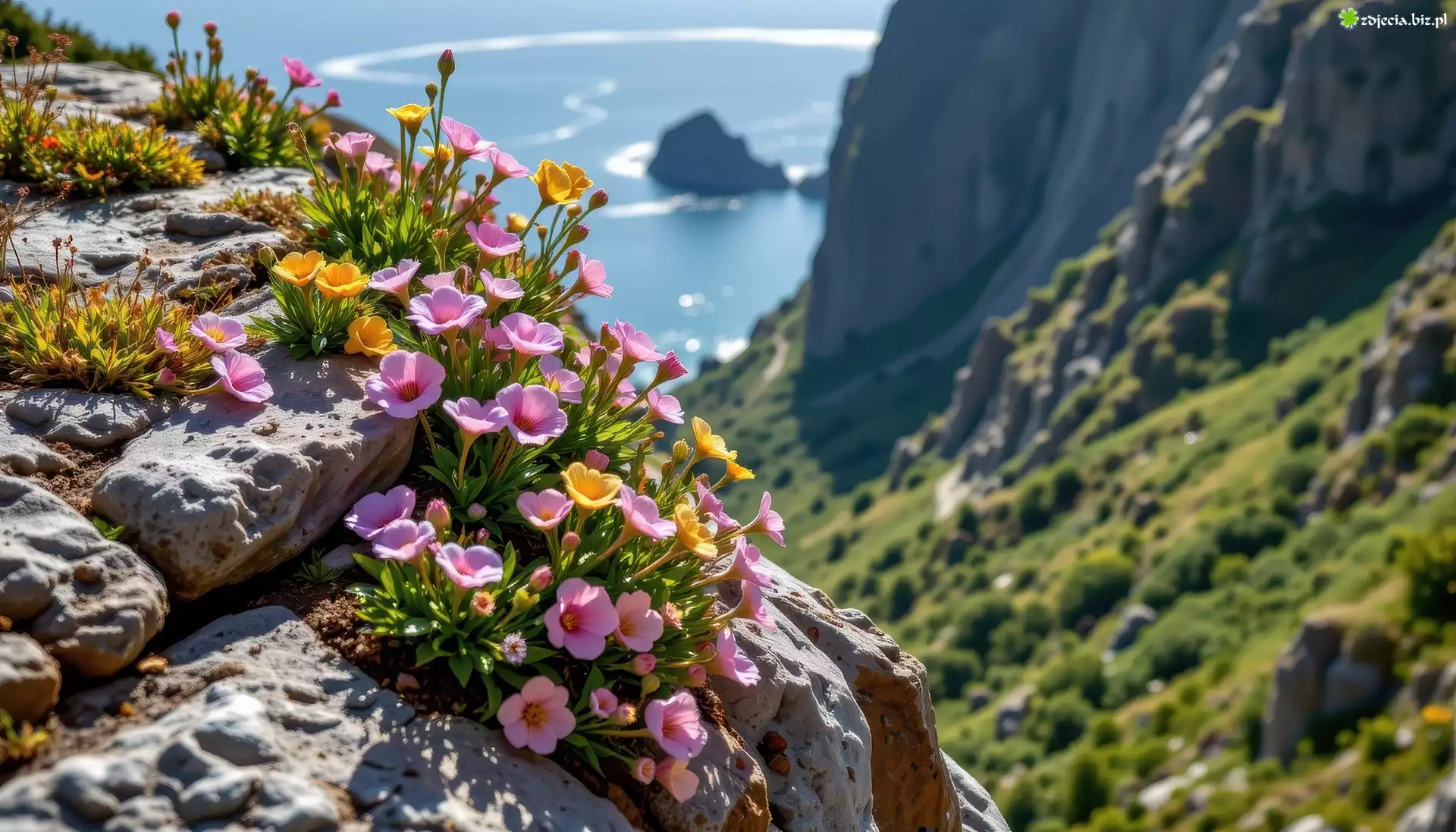 Zdjęcie Kwiaty, Skały, Łąka, Klif, Morze, Grafika