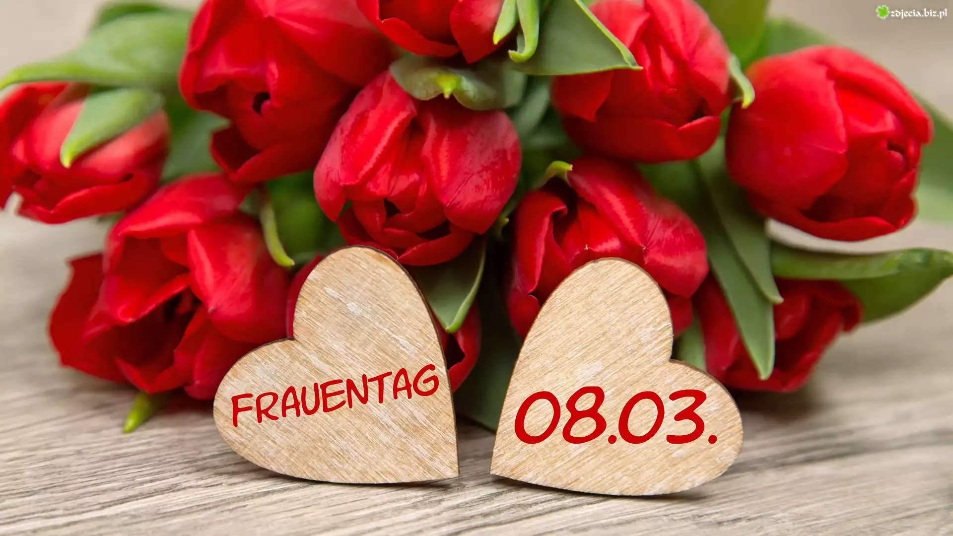 Zdjęcie Dzień Kobiet, Bukiet, Czerwone, Tulipany, Serca, Napis