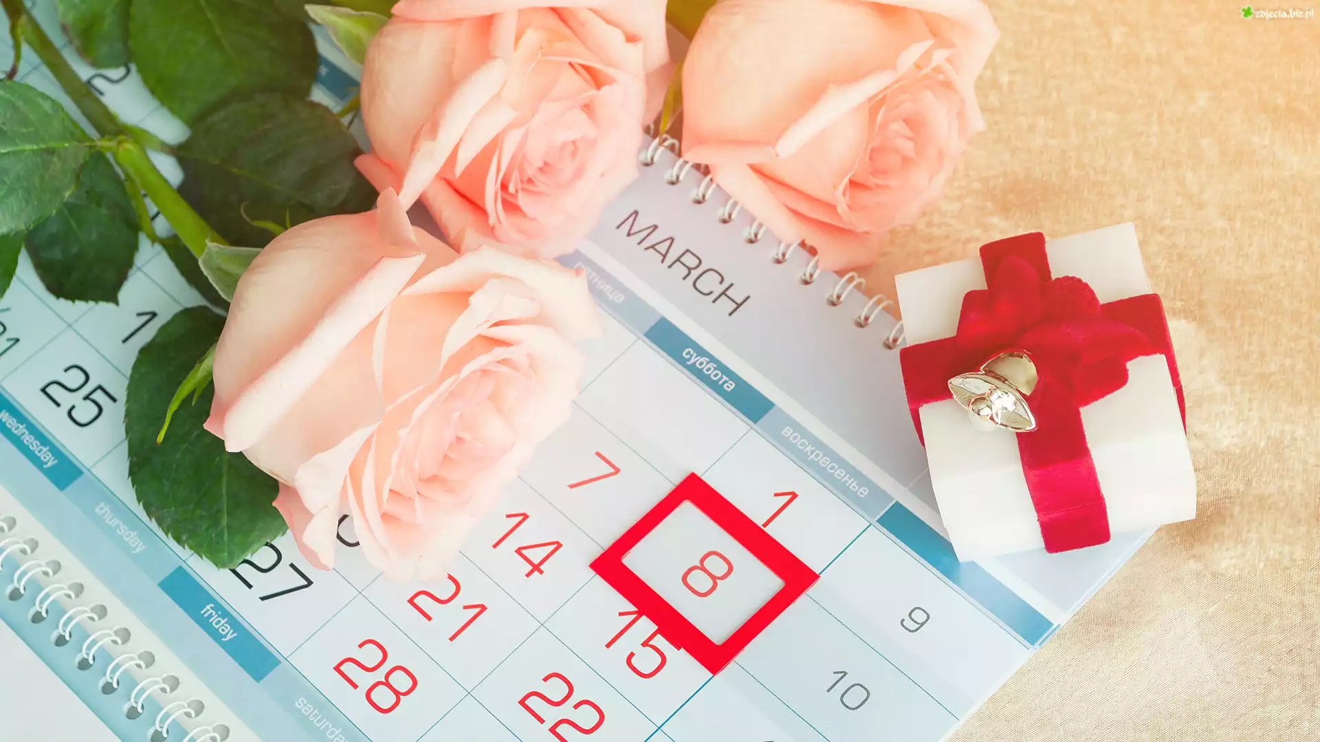 Zdjęcie Dzień kobiet, Bukiet, Trzy, Róże, Kalendarz, Prezent