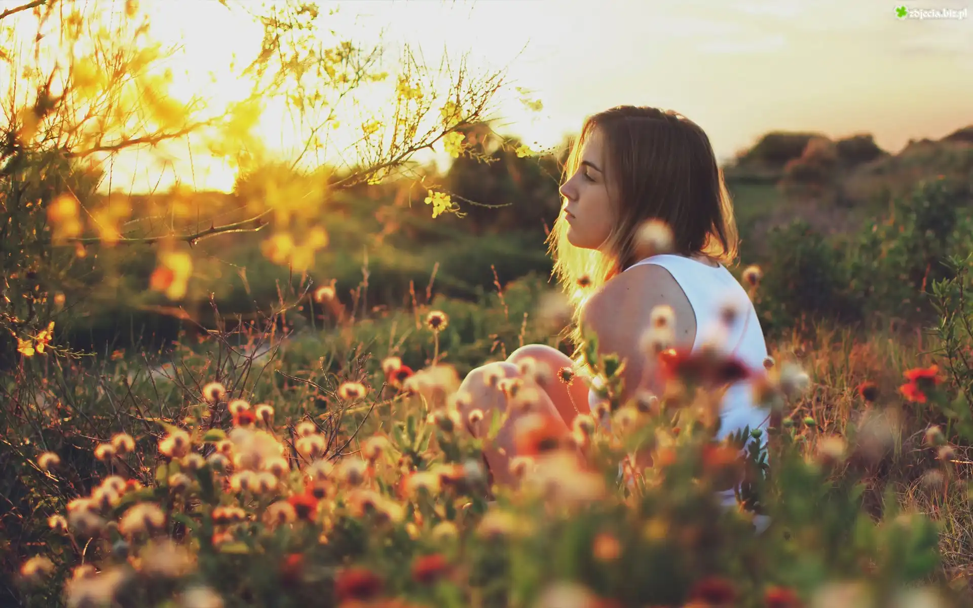 Zdjęcie Kobieta, Promienie, Słońca, Łąka, Kwiaty