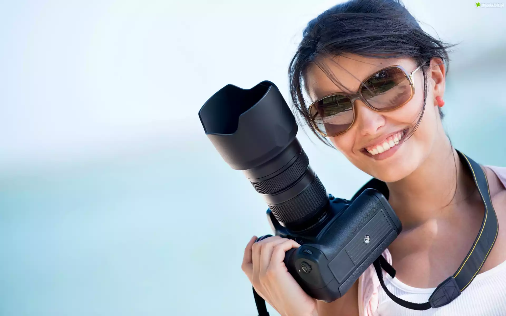 Zdjęcie Kobieta, Uśmiech, Okulary, Aparat, Fotograficzny