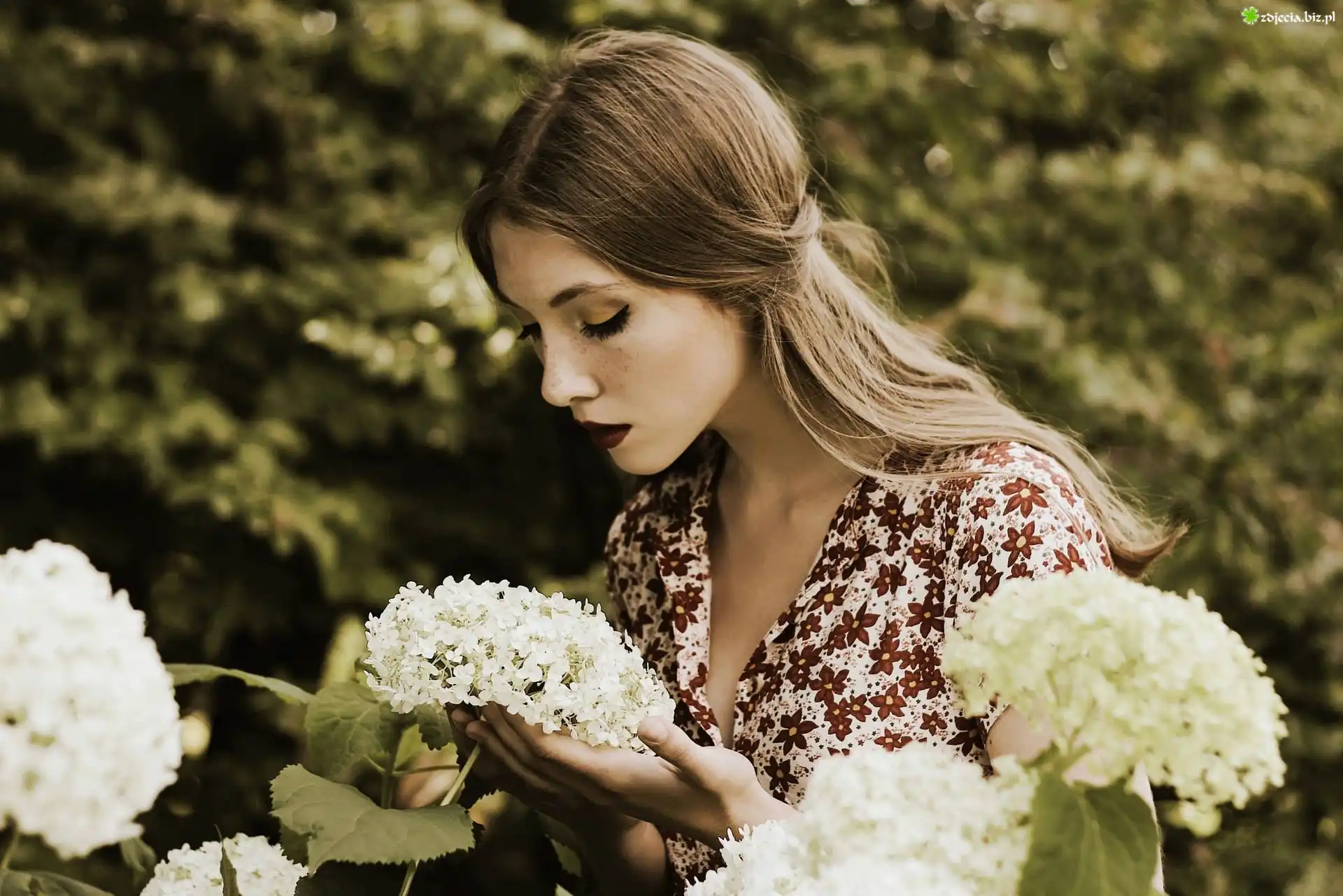 Zdjęcie Kobieta, Blondynka, Makijaż, Białe, Kwiaty