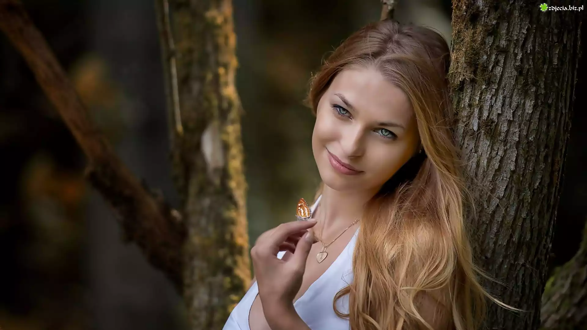 Zdjęcie Blondynka, Kobieta, Makijaż, Bizuteria, Motylek, Drzewo, Park