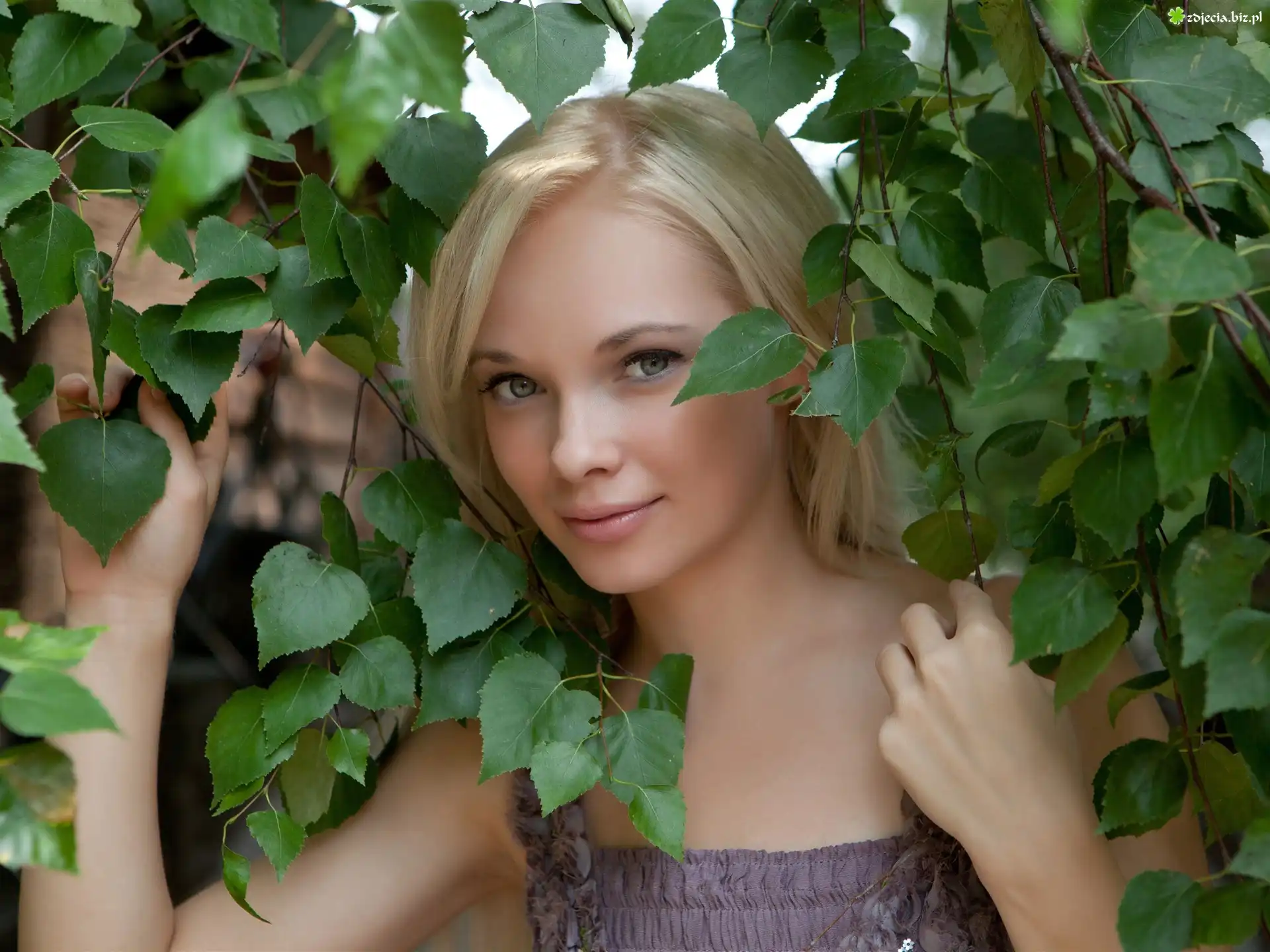 Zdjęcie Kobieta, Uśmiechnięta, Blondynka, Liście