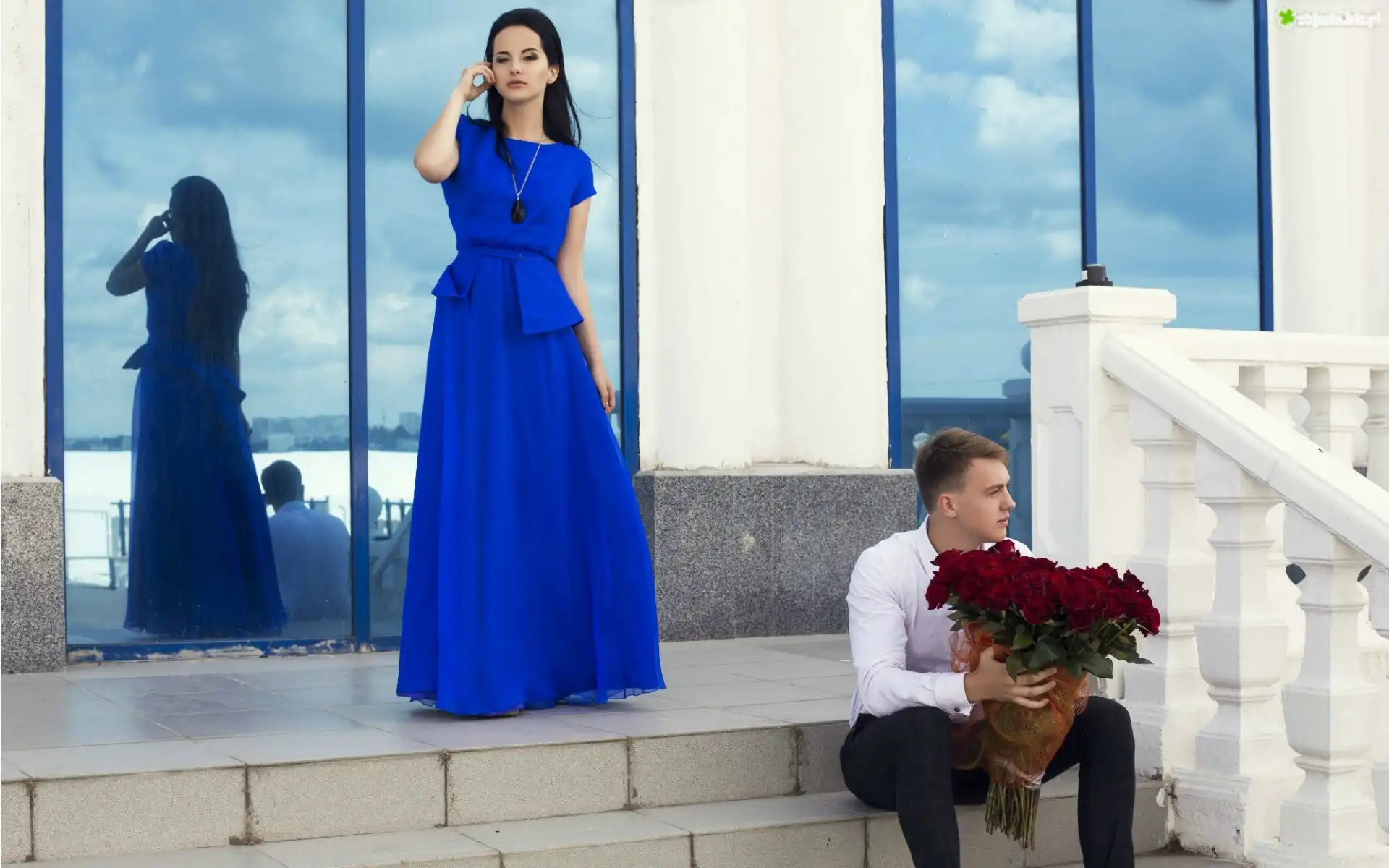 Zdjęcie Kobieta, Mężczyzna, Bukiet, Róż, Budynek, Schody