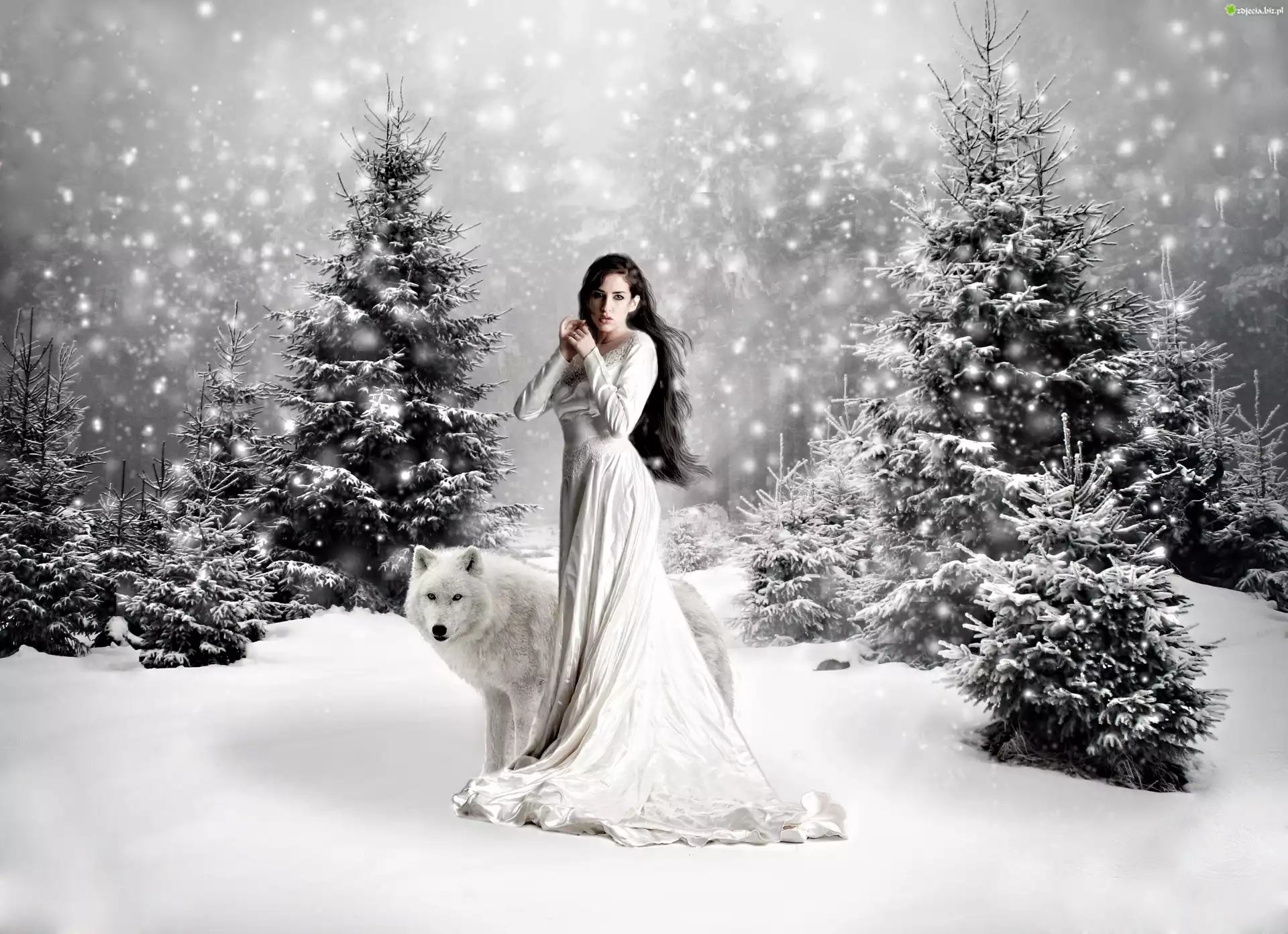 Zdjęcie Kobieta, Wilk, Choinki, Zima