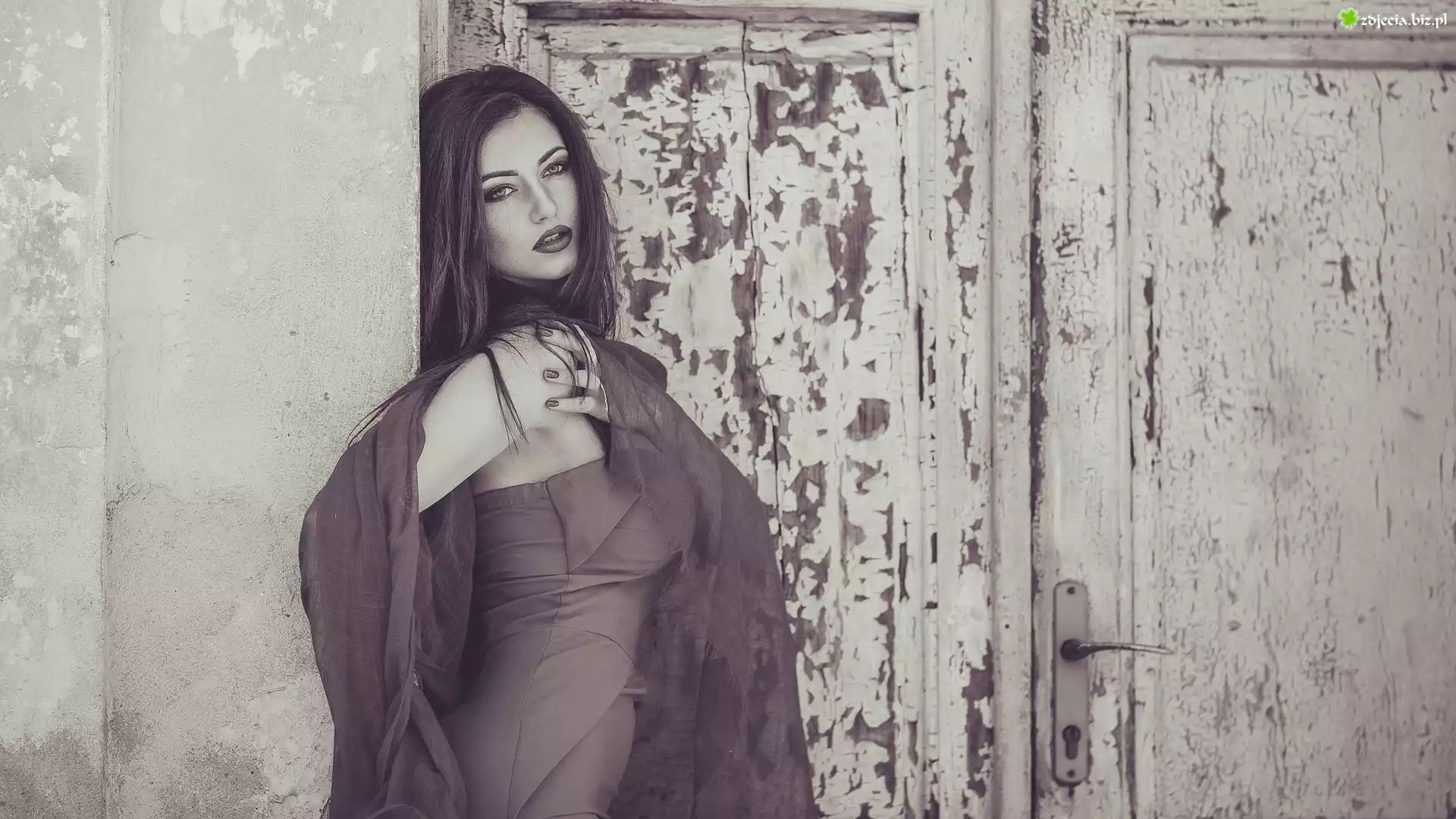 Zdjęcie Kobieta, Drzwi, Ściana, Sepia
