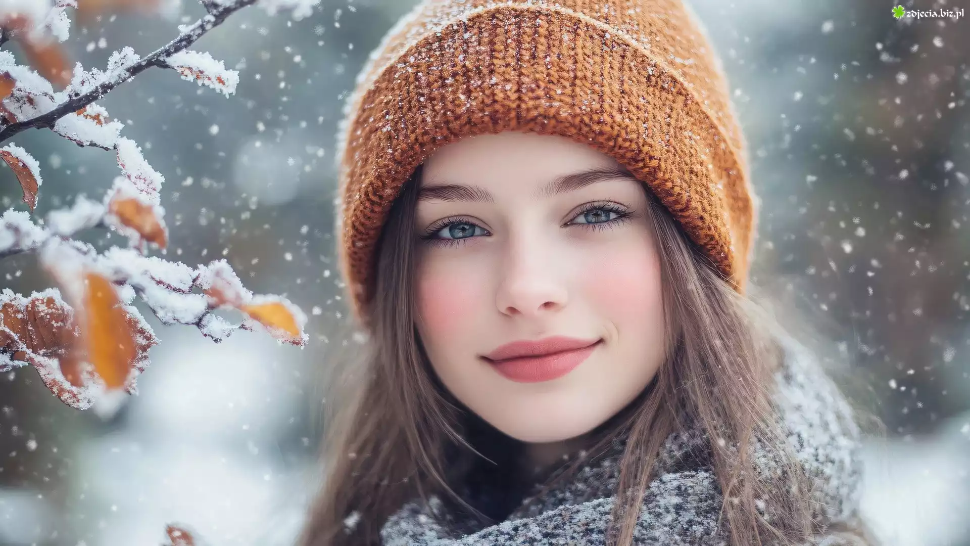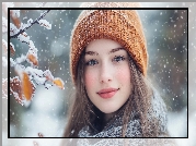 Zdjęcie Długowłosa, Kobieta, Czapka, Ośnieżona, Gałązka