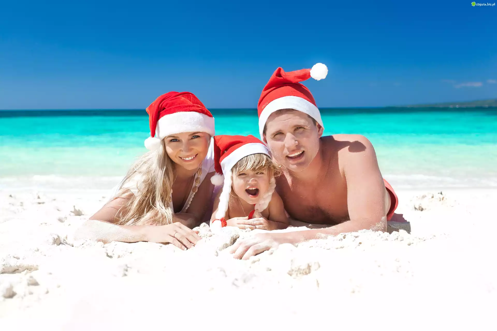Zdjęcie, Kobieta, Mężczyzna, Dziecko, Plaża, Czapki, Mikołaja