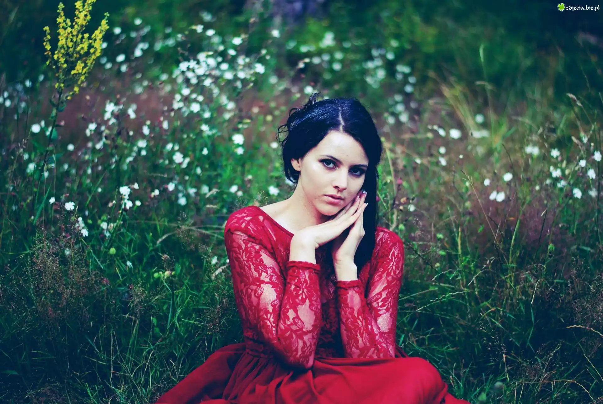Zdjęcie, Kobieta, Brunetka, Czerwona, Sukienka