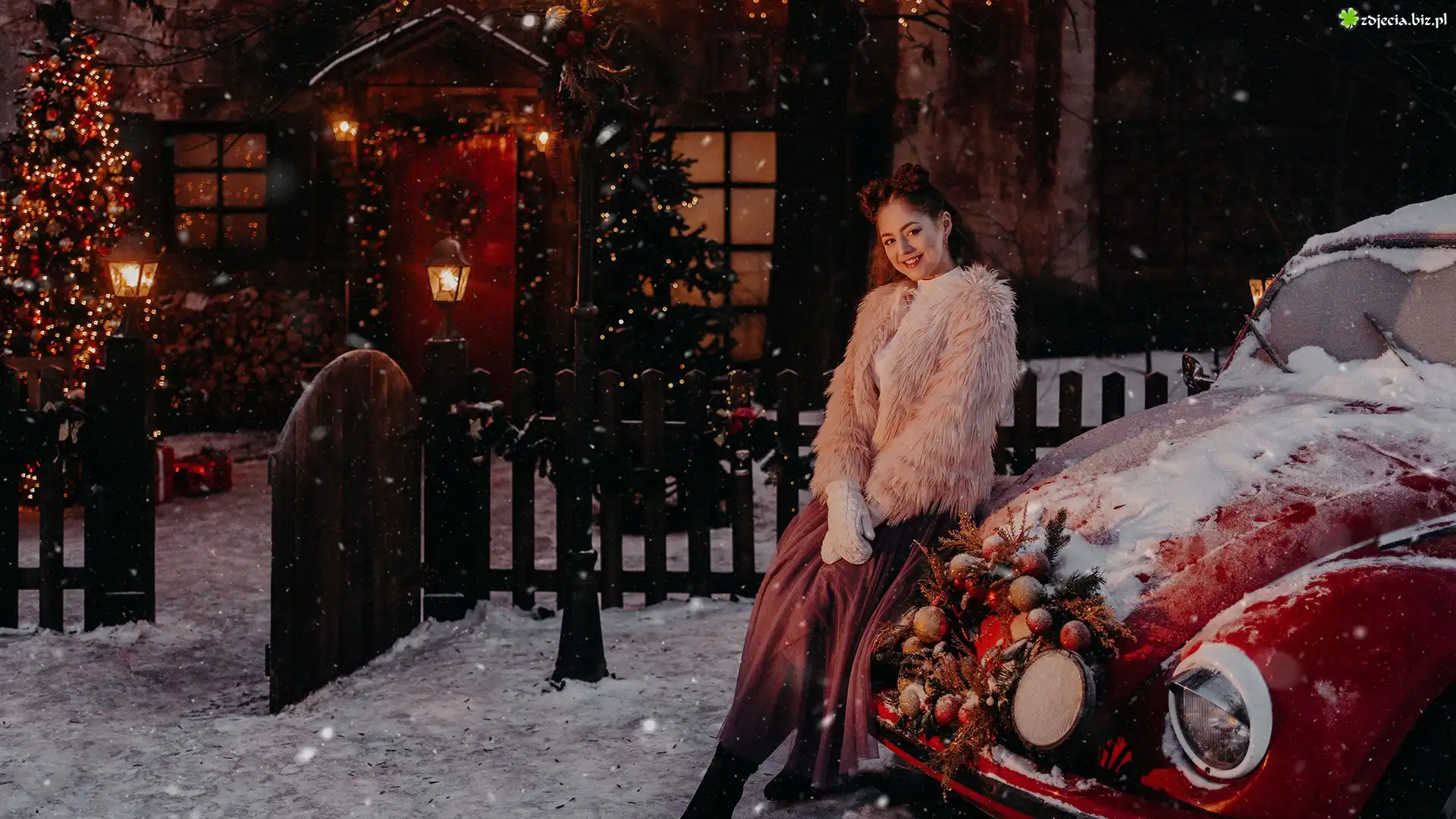 Zdjęcie Samochód, Kobieta, Śnieg, Uśmiech, Boże Narodzenie, Drzewo, Dom