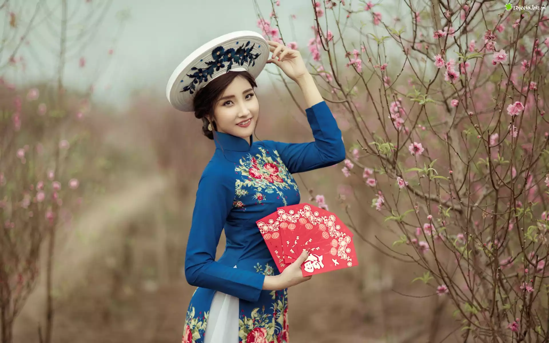 Zdjęcie Kobieta, Wachlarz, Kwitnące, Drzewa, Kapelusz