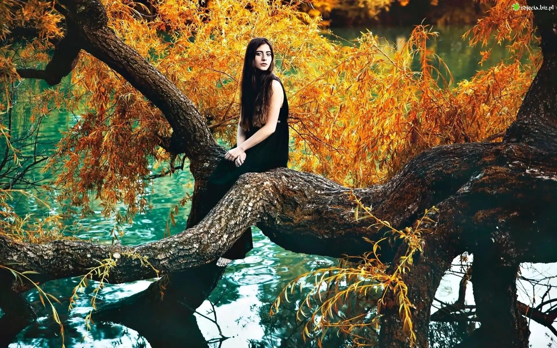 Zdjęcie Kobieta, Staw, Drzewo, Jesień