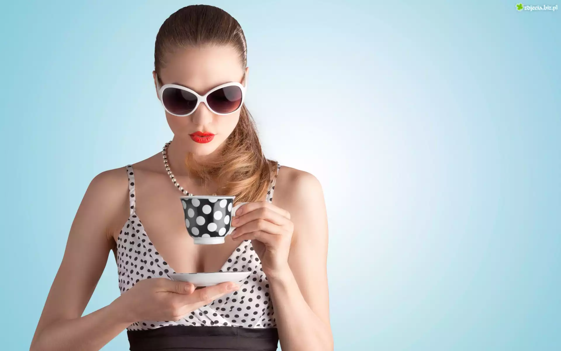 Zdjęcie Kobieta, Okulary, Makijaż, Filiżanka, Talerzyk