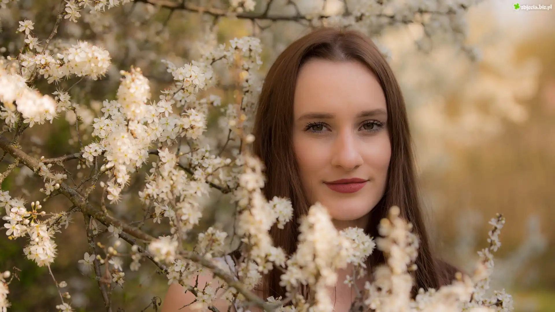Zdjęcie Kobieta, Szatynka, Twarz, Gałązki, Kwiaty