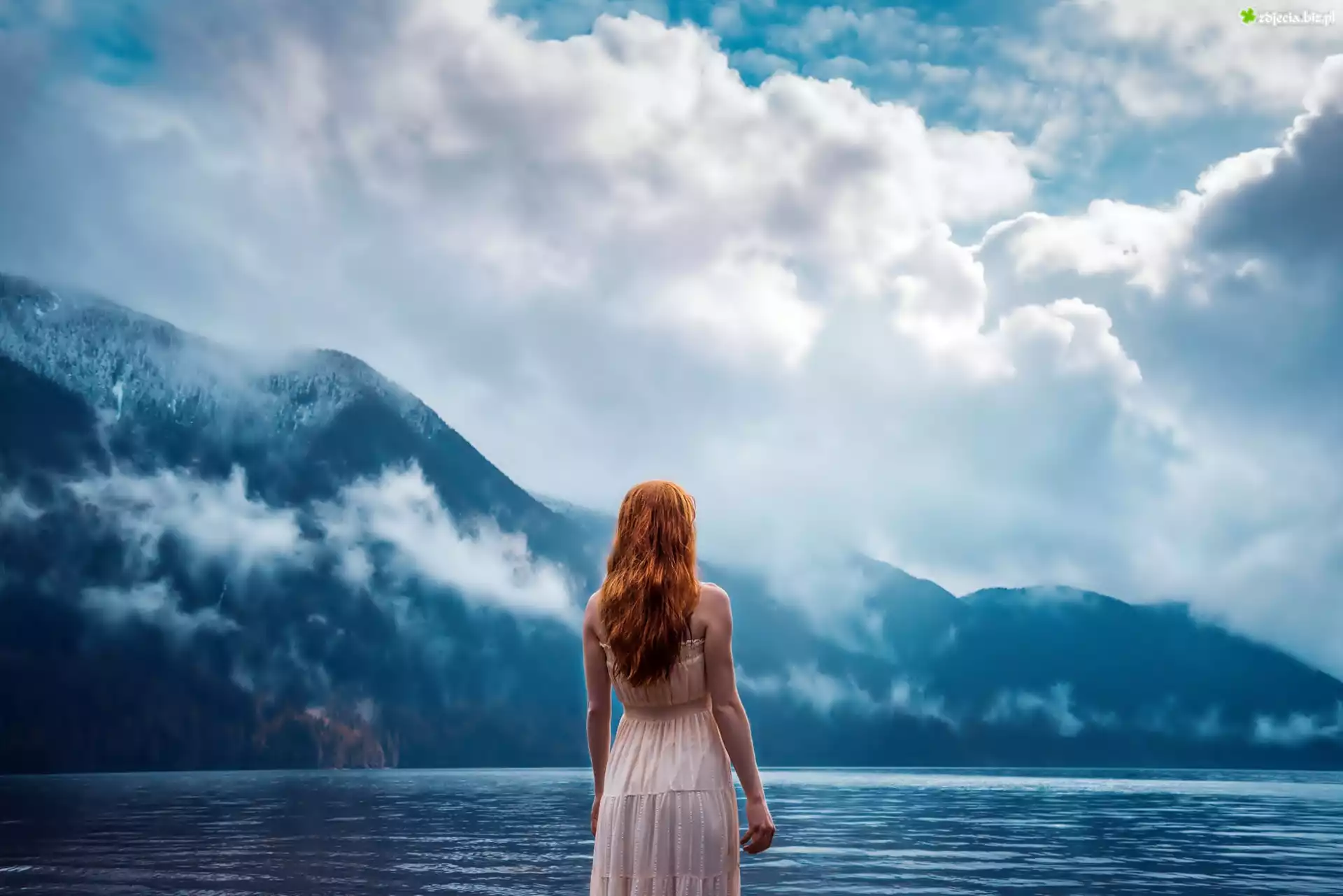 Zdjęcie Kobieta, Góry, Chmury, Jezioro, Mgła