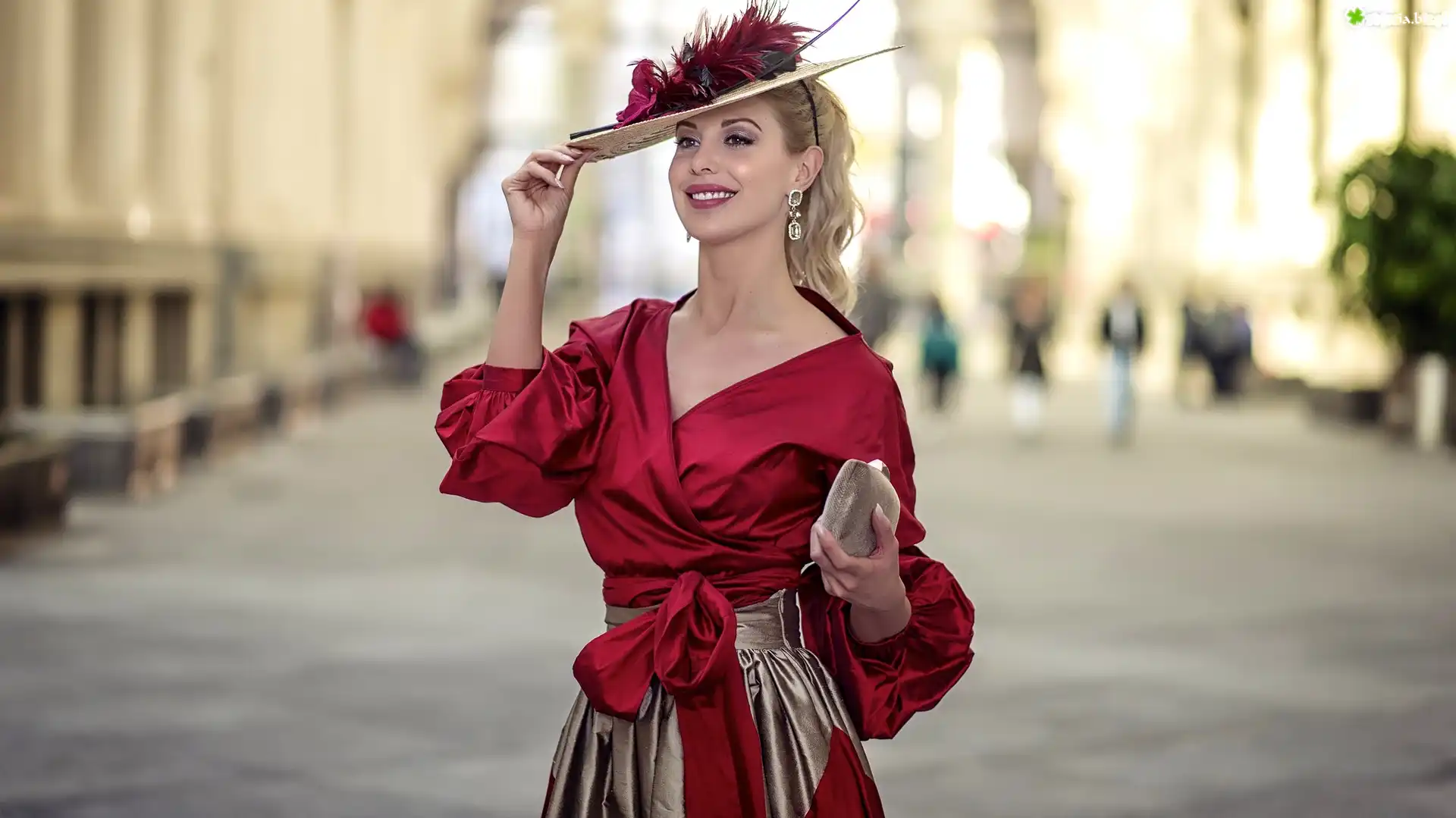 Zdjęcie, Kobieta, Blondynka, Czerwona, Bluzka, Kapelusz, Torebka