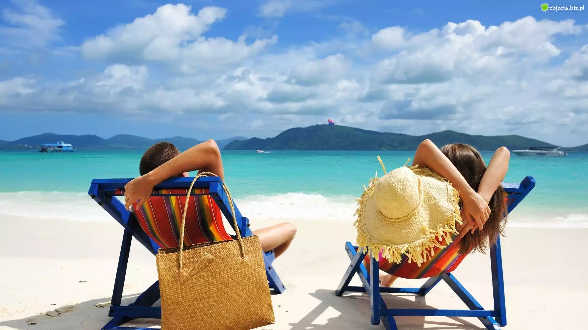 Zdjęcie Kobieta, Mężczyzna, Plaża, Leżaki, Morze, Torba, Kapelusz, Wakacje