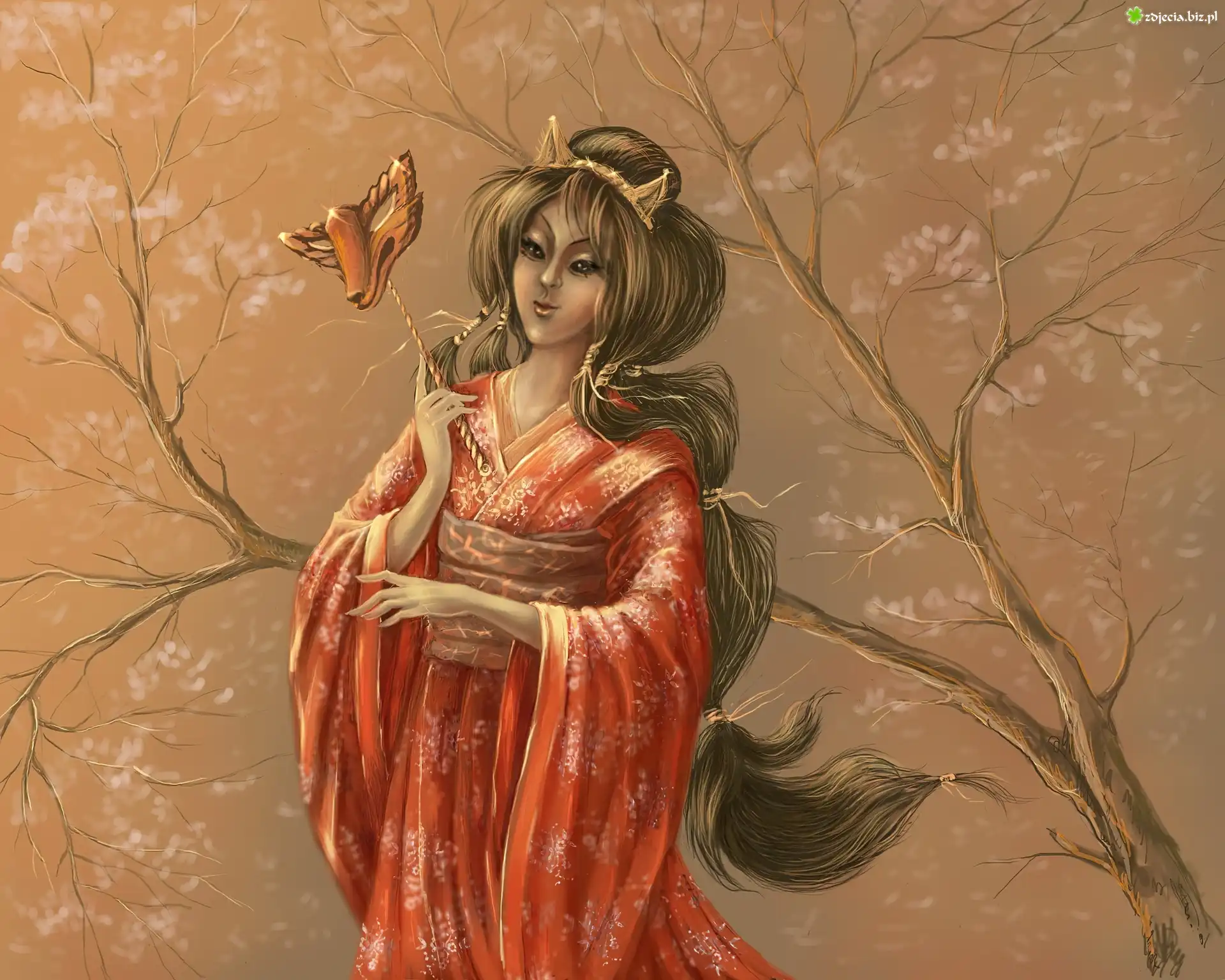 Zdjęcie Kobieta, Maska, Kimono, Drzewo