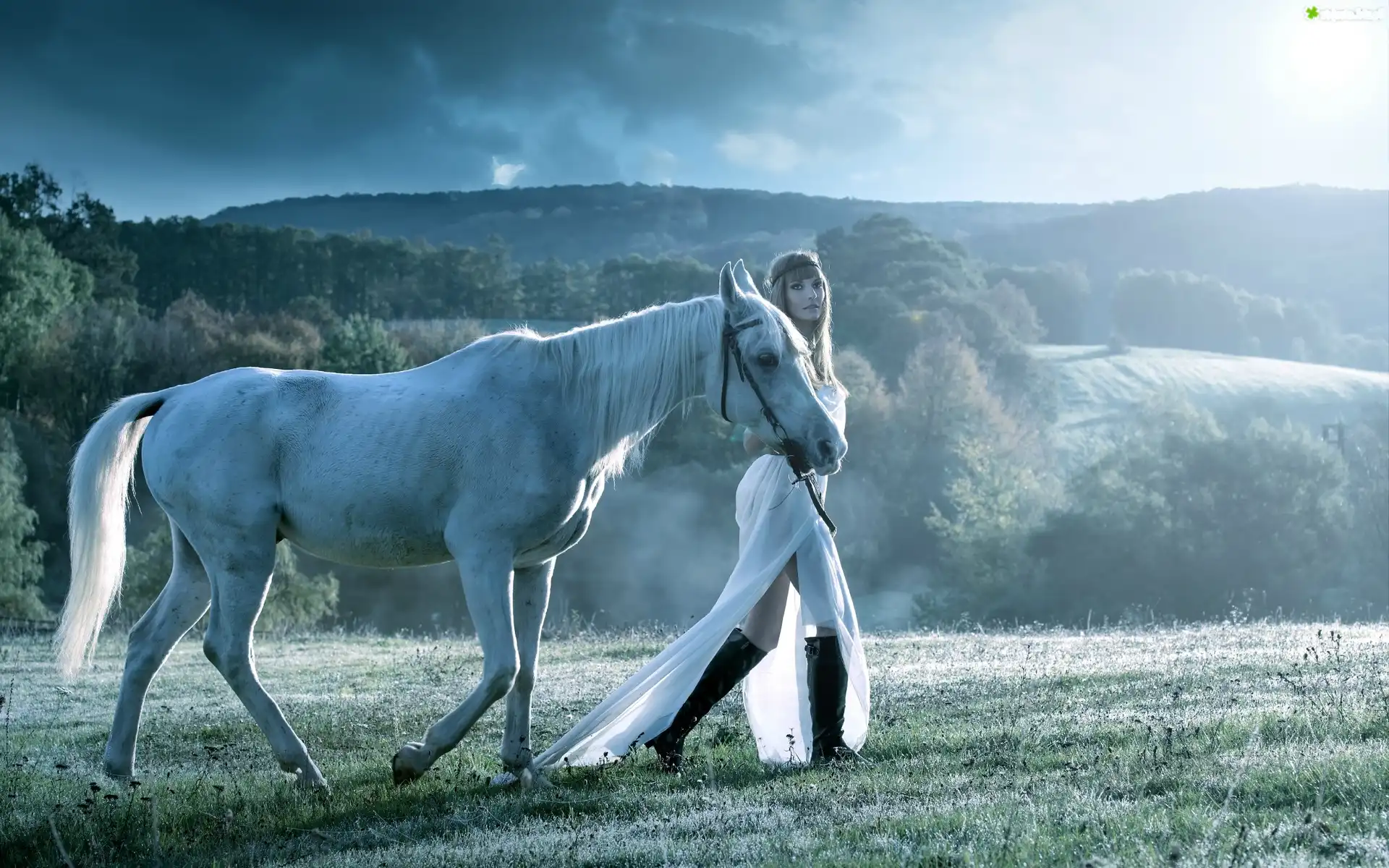 Zdjęcie Koń, Kobieta, Łąka, Mgła, Góry, Lasy, Poranek