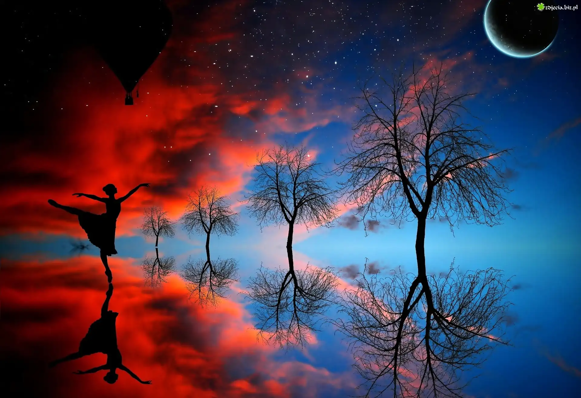 Zdjęcie Kobieta, Taniec, Drzewa, Księżyc, Gwiazdy