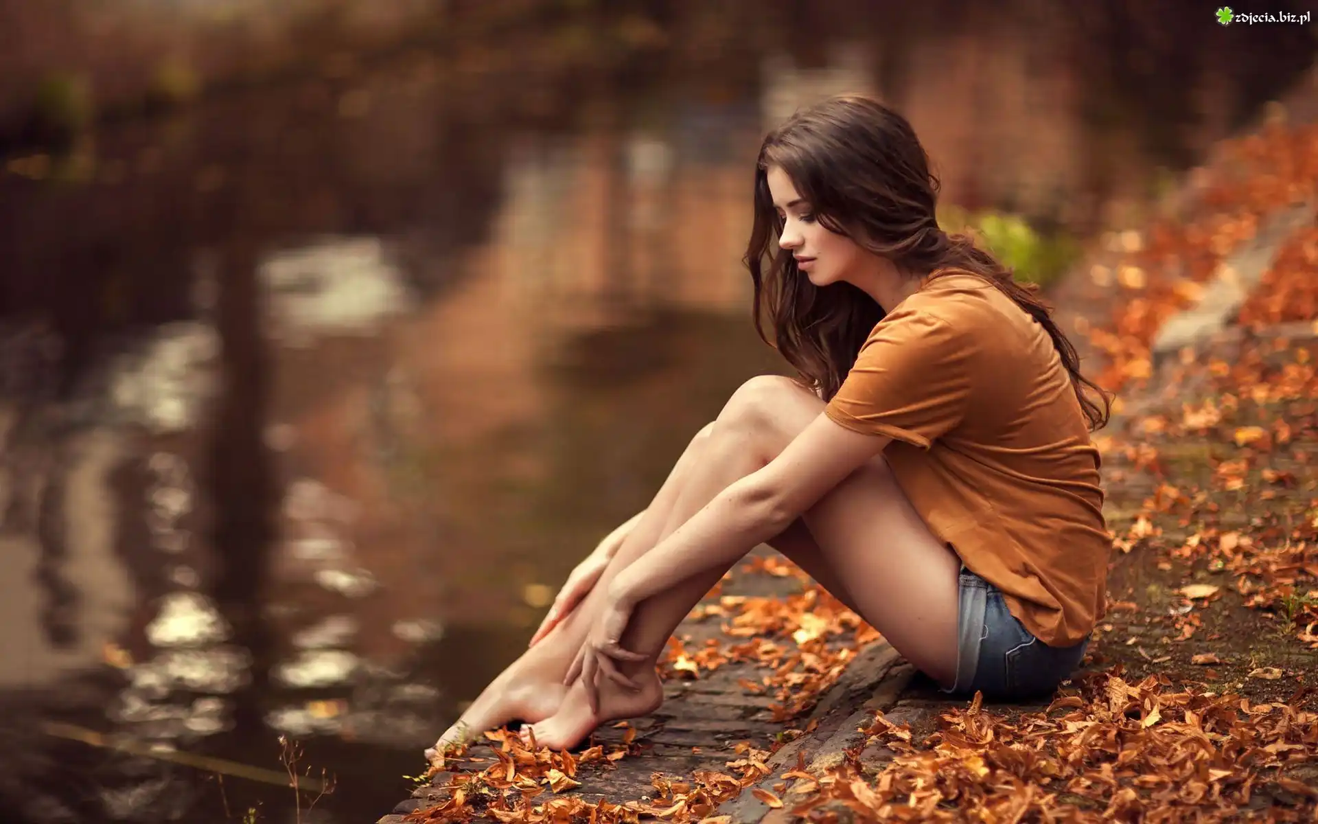 Zdjęcie, Kobieta, Brunetka, Rzeka, Kanał, Liście, Jesień