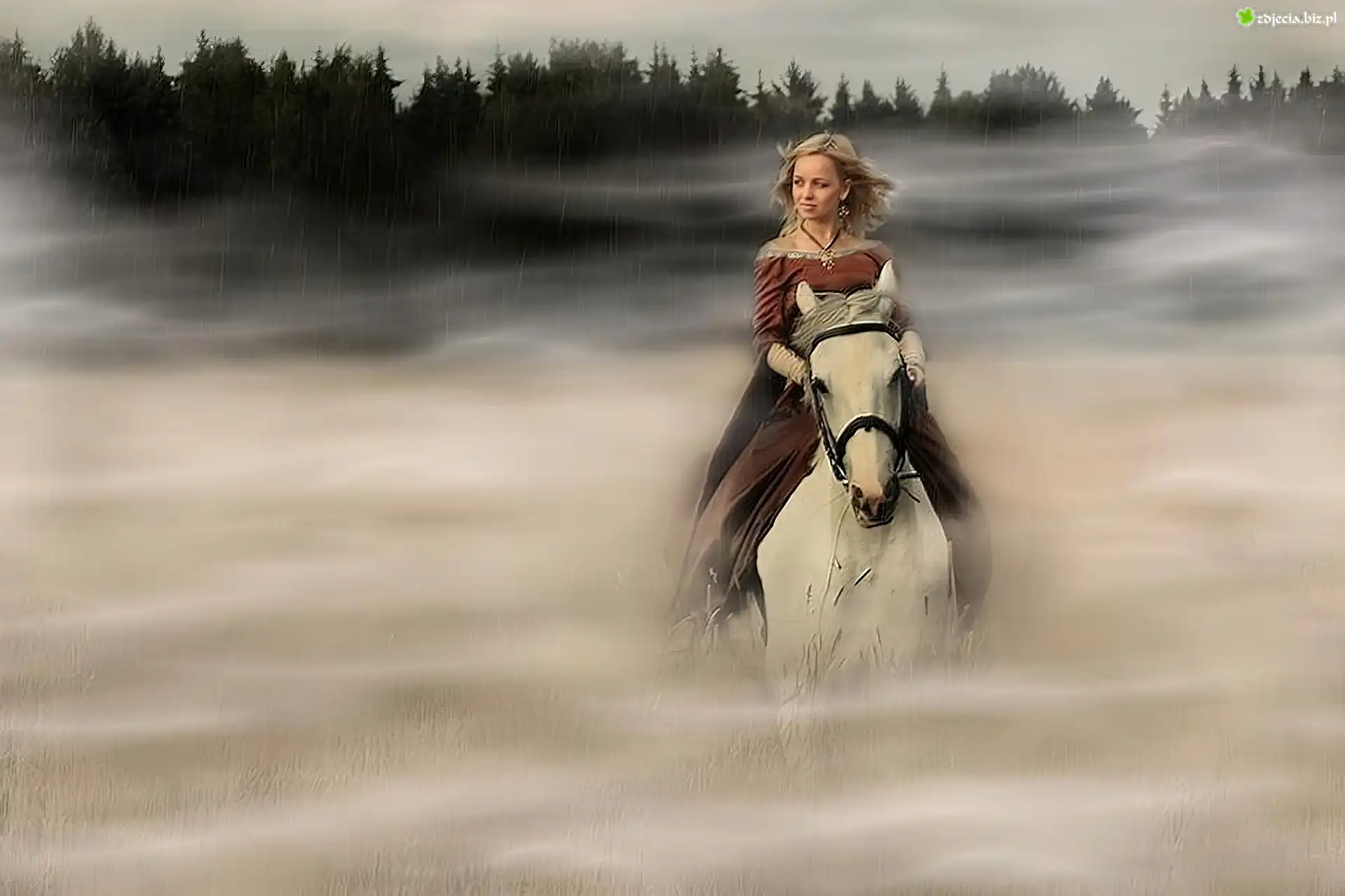 Zdjęcie Kobieta, Koń, Mgła, Las